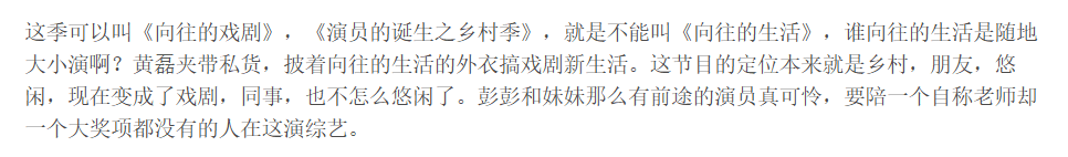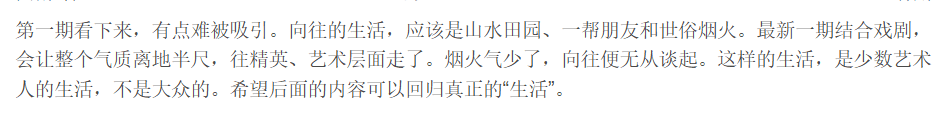 “第一期看下来,有点难被吸引。向往的生活应该是山水田园,一帮朋友和世俗烟火。最新一期结合戏剧,会让整个气质离地半尺,往精英、艺术走了。烟火气少了,向往便无从谈起。”