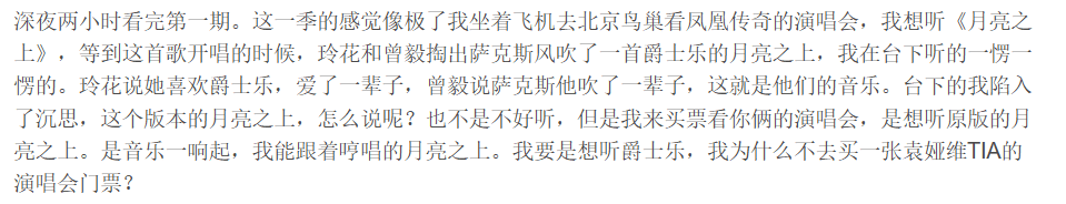 他认为看完第一期的感觉像极了自己去看凤凰传奇的演唱会,本想听原汁原味的《月亮之上》,玲花和曾毅却掏出了萨克斯风出了一首爵士版的《月亮之上》,并说这就是他们的音乐。并不是说,爵士版不好听,但如果要听爵士,为什么不去看袁娅维呢?