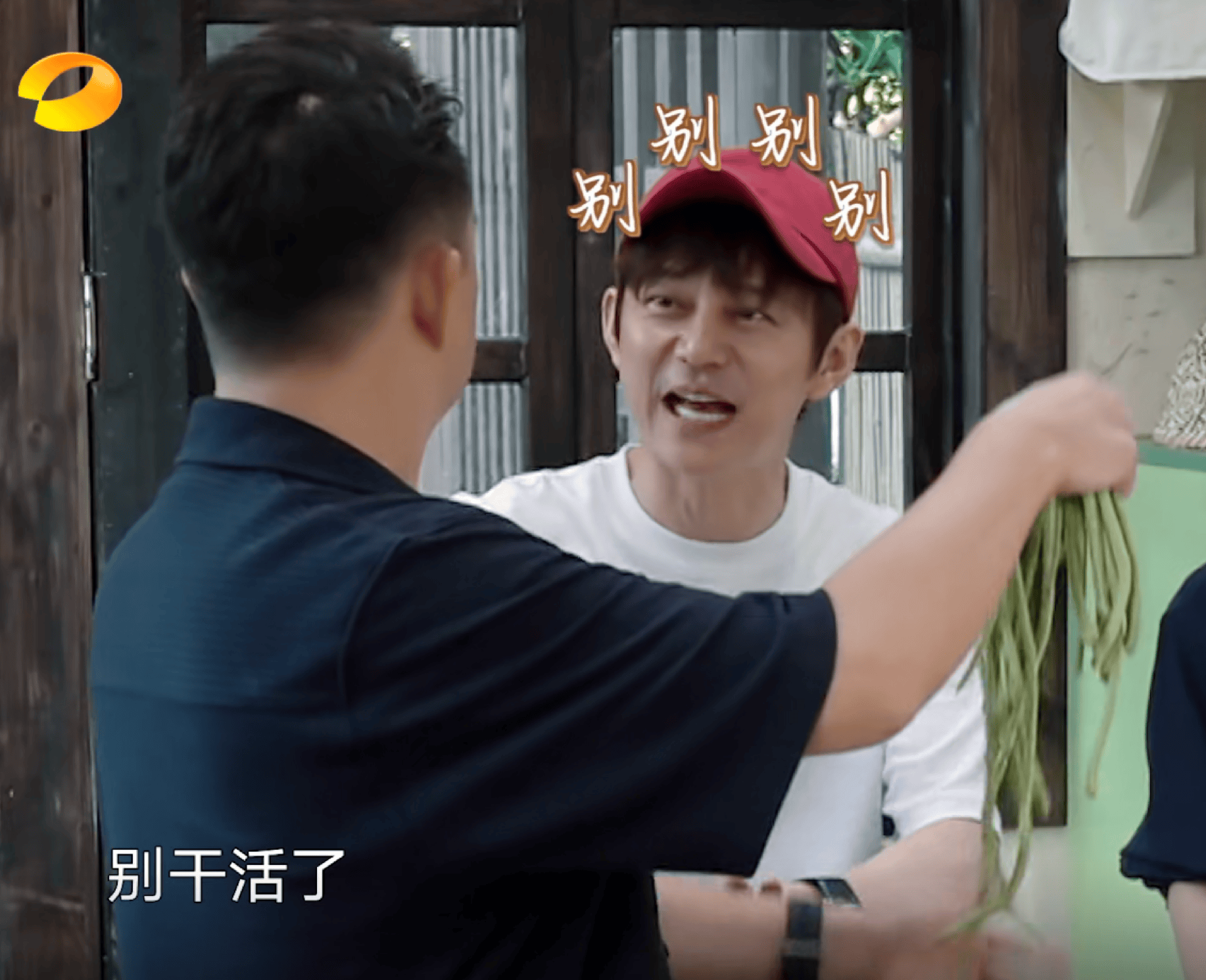 赞助商出品的胡椒味米糊就摆在显眼的位置,黄磊还特意拿起了一把豆角,何炅赶紧劝:别干活了。