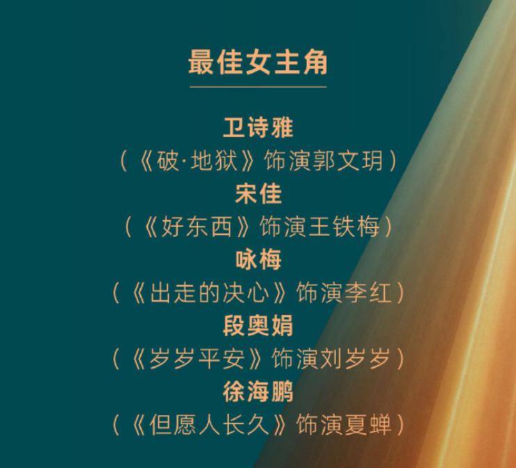 卫诗雅、宋佳、咏梅已是影后,段奥娟是首次“触电”,徐海鹏是中生代演员中的佼佼者。