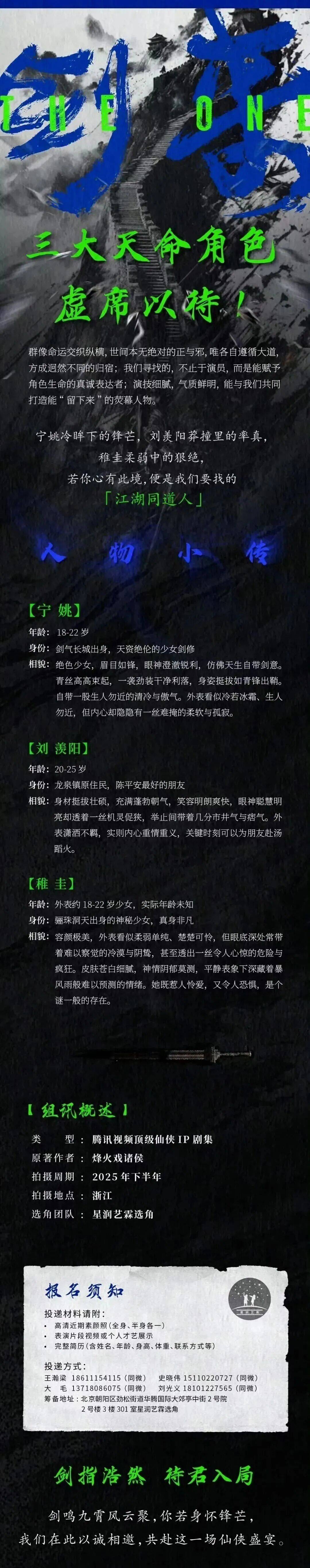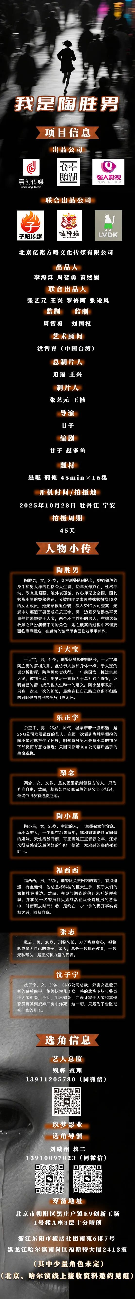 免责声明:戏客Seeker公众号(“本平台”)中全网组讯的信息、内容(“组讯信息”,包括但不限于影视项目名称、项目介绍信息、出品公司信息、导演信息、选角团队信息、拍摄相关信息、联系方式等)均来源于内容信息相关方提供或互联网公开信息。本平台不对组讯信息的真实性、准确性、完整性、及时性、关联性、适用性及安全性提供任何明示或默示的担保。请您谨慎参考或使用组讯信息,并确保您的人身、财产安全,本平台不对您使用或参考组讯信息而造成的后果承担任何责任。