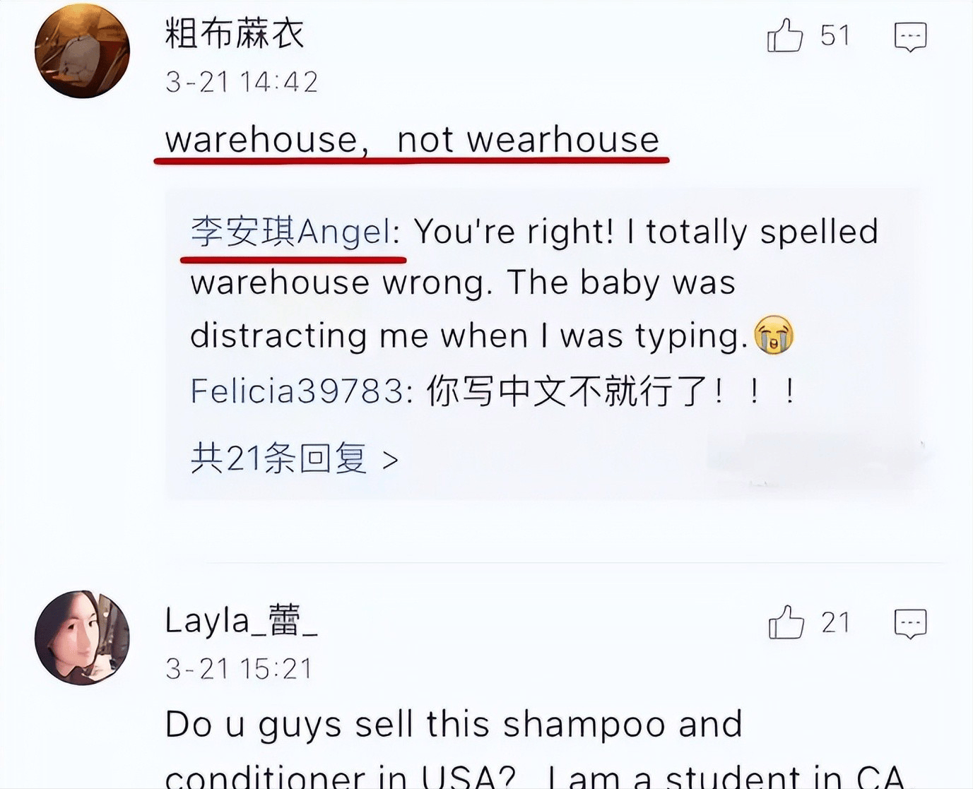 网友们并不买账,大家质疑,明明生活在中国这么些年了,但李安琪的社交平台还是只回复一些英文的评论。