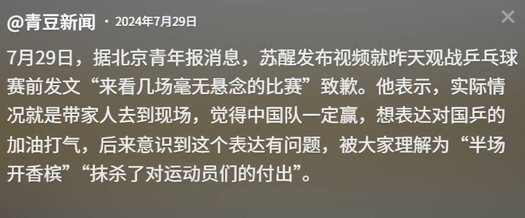 此外还有网友扒出,去年苏醒因在观看某场乒乓球赛前发文“来看几场毫无悬念的比赛”而引发热议。