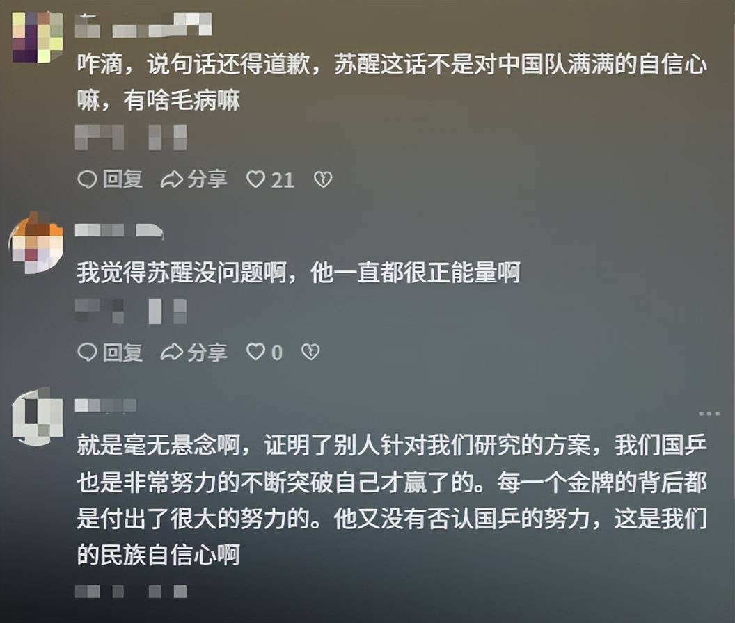 因为有网友认为,苏醒的言语忽视了运动员的艰辛付出,也给运动员加上了一种无形的压力。