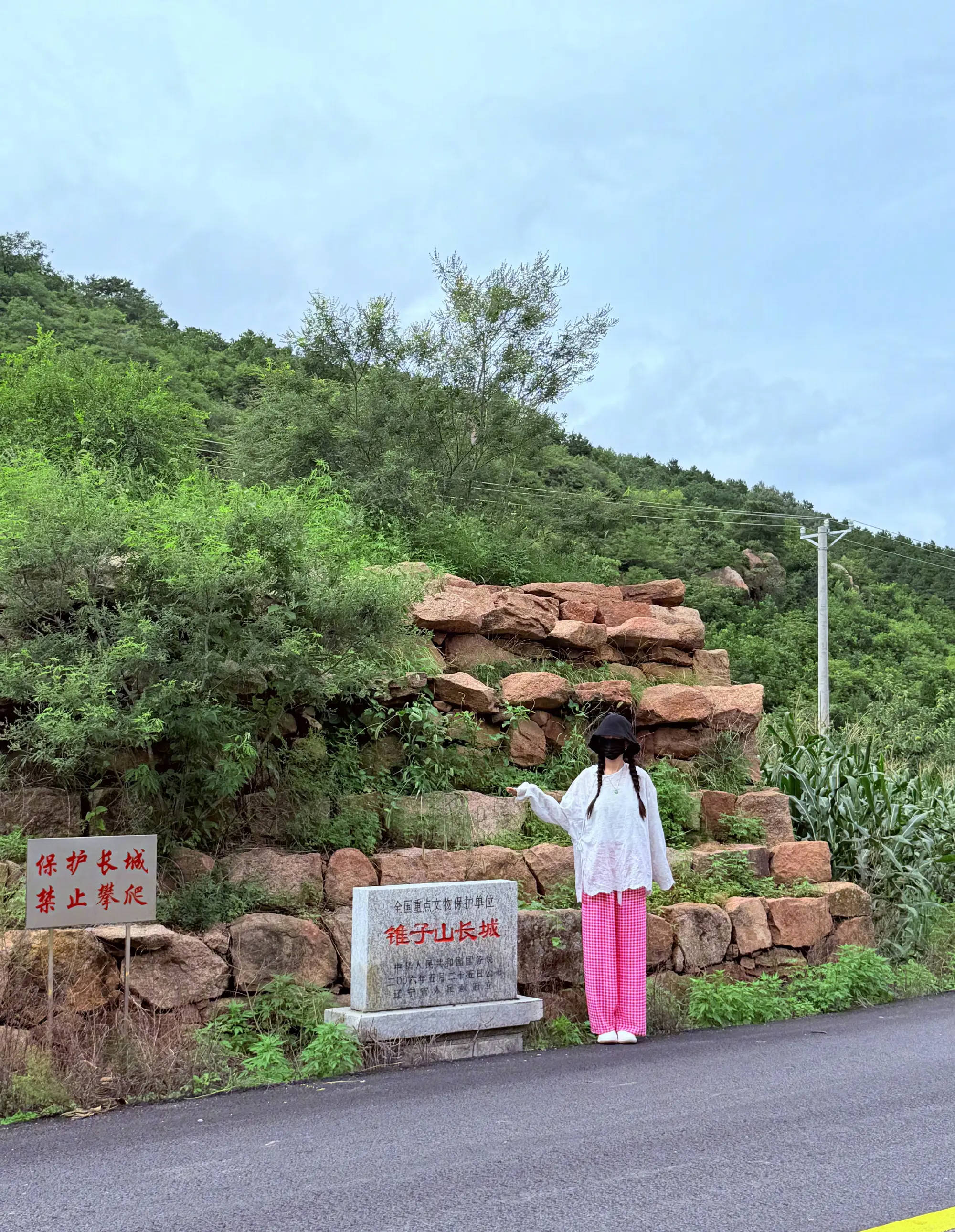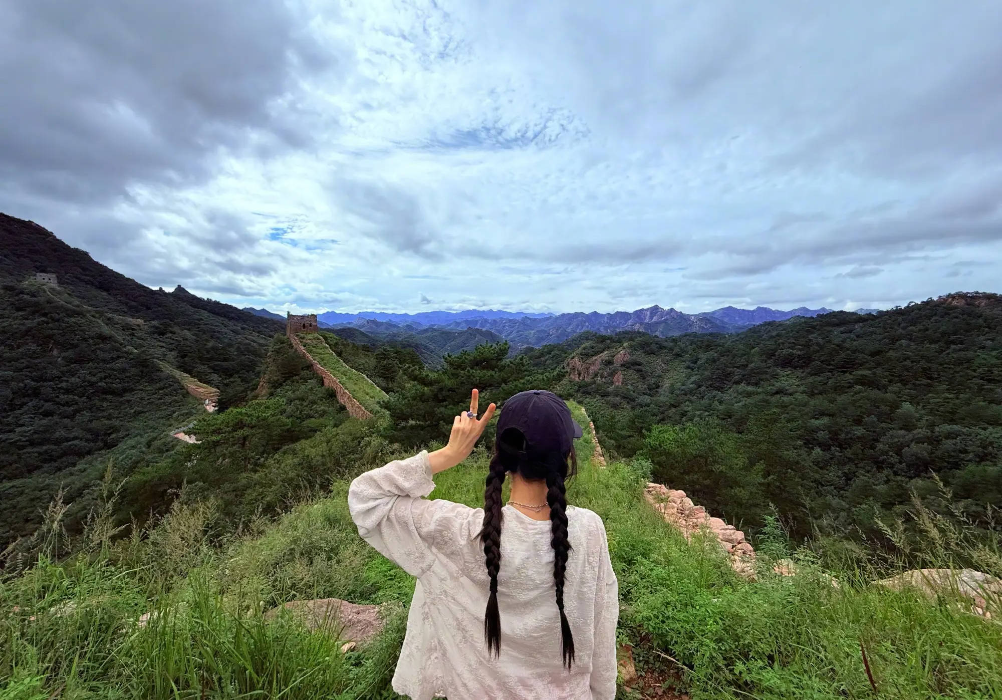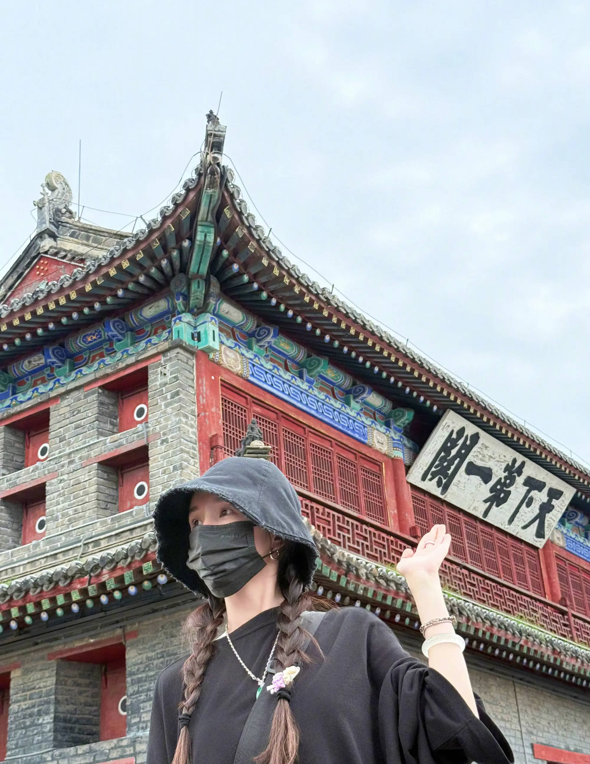 杨幂拍旅游打卡照,身后的石碑上写着“爱我中华,修我长城”。