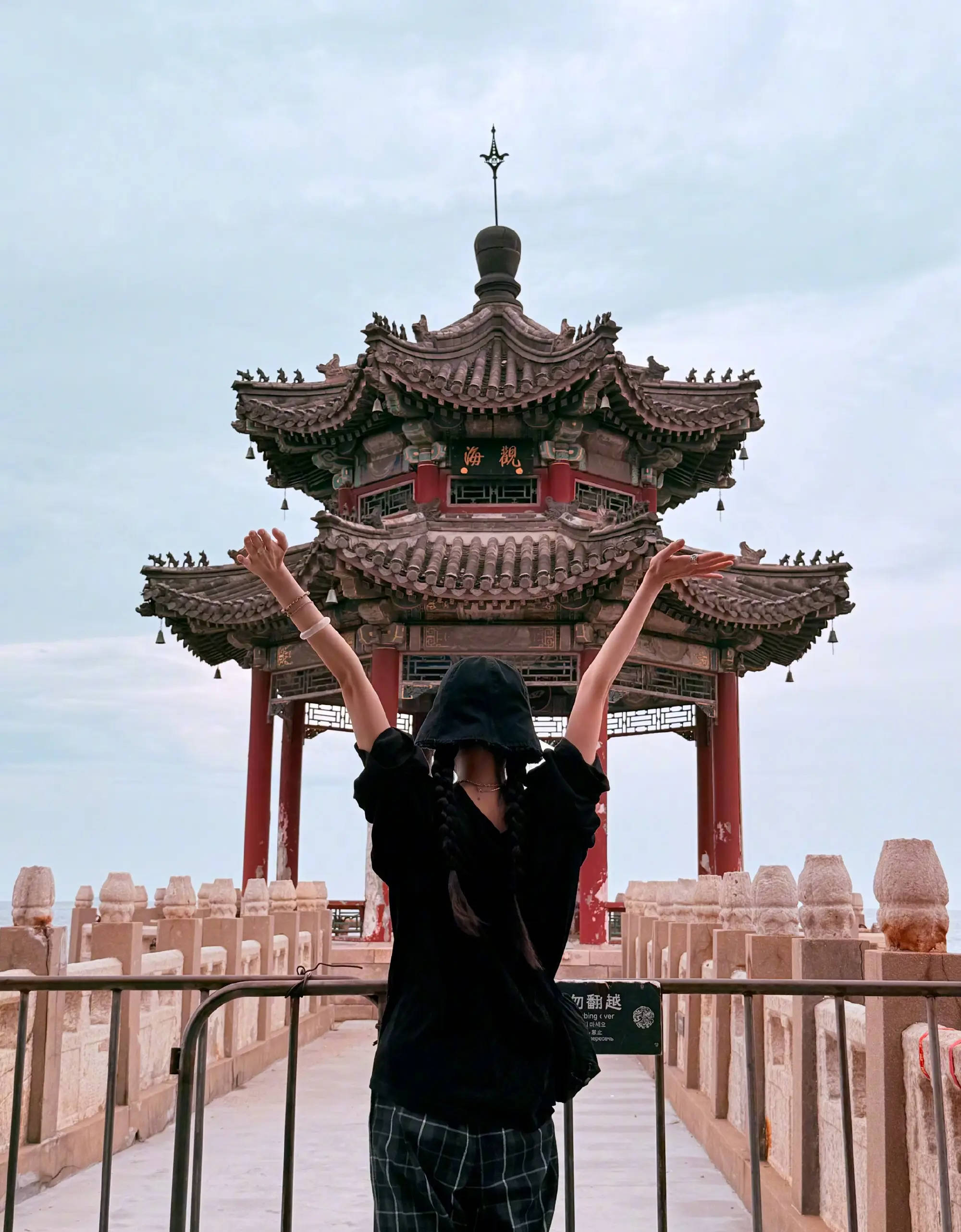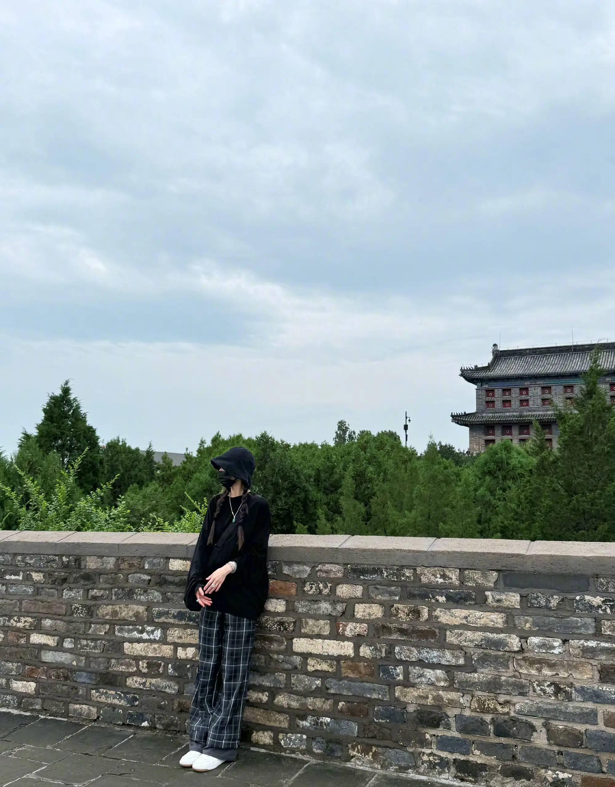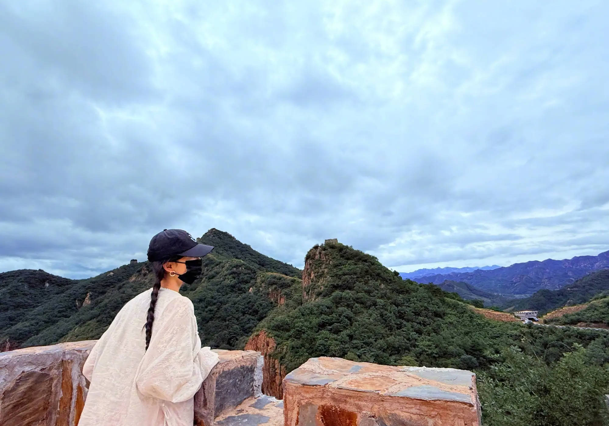 杨幂拍旅游打卡照,身后的石碑上写着“爱我中华,修我长城”。