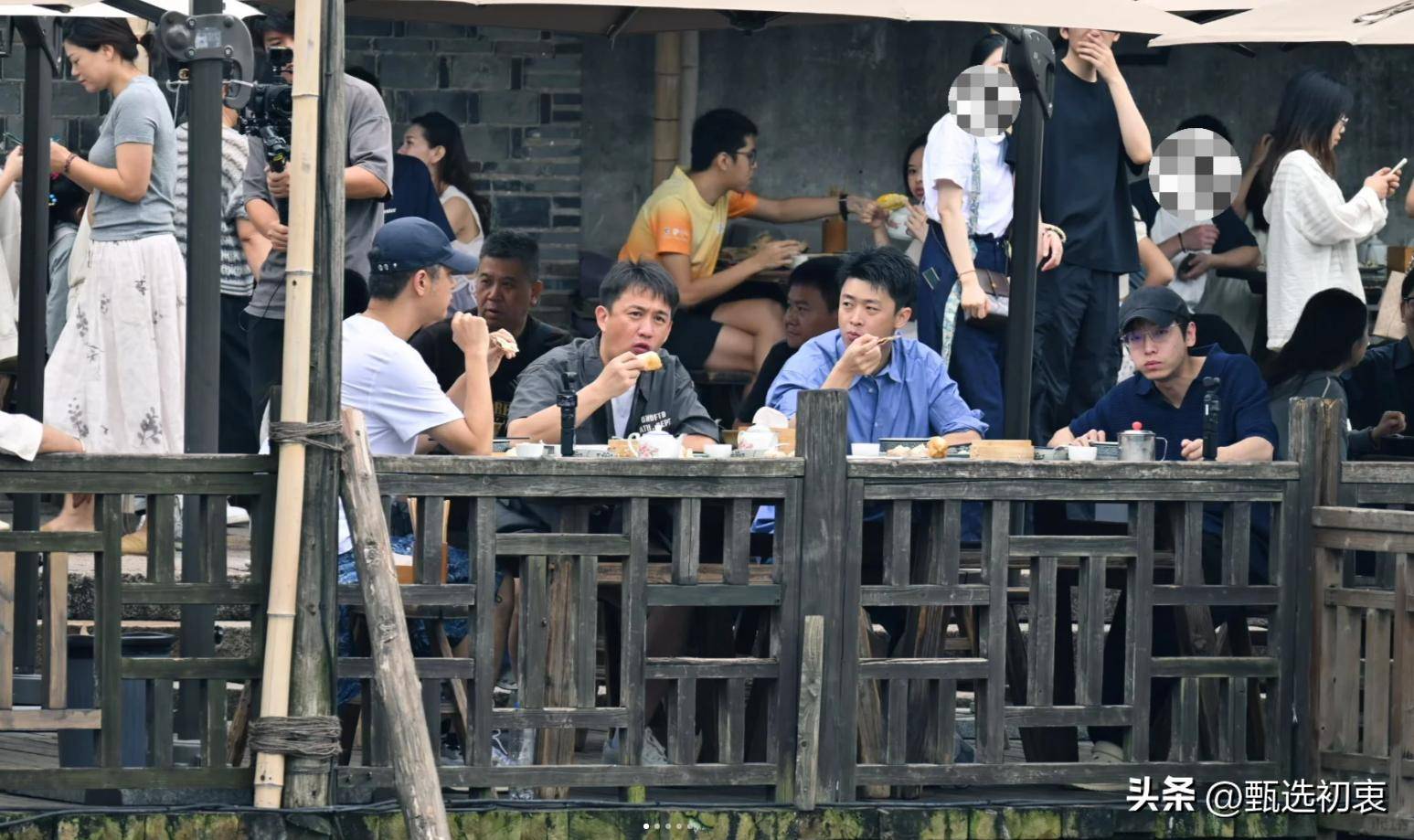有网友也在那里偶遇了几个人吃早餐,黄老师状态没什么改变,穿了一件灰色衬衫,彭彭在旁边,戴了一顶帽子,还有其他两个嘉宾,四个人在户外,周围有不少人。