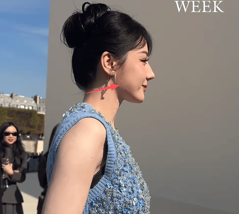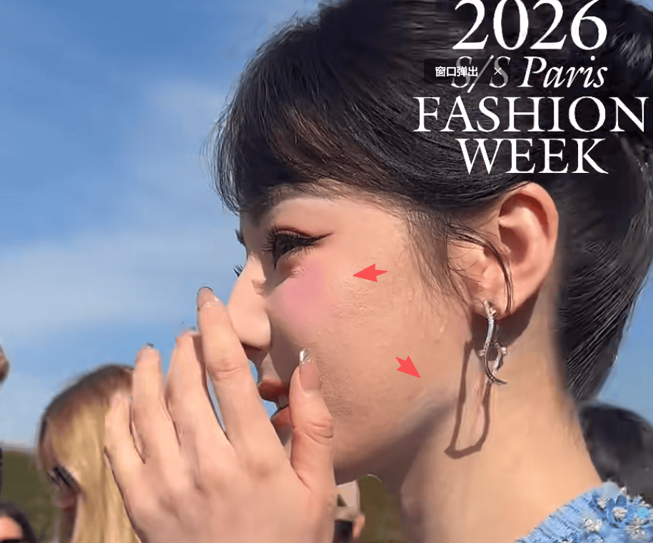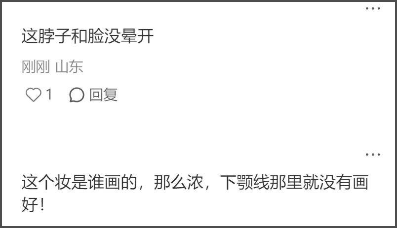 妆容也化得不好,不知道是故意画黑了,还是打得阴影,下颌线衔接处非常不自然,从侧面看分层很明显。