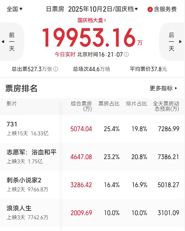 接着10月1日,新片都来了,国庆档竞争迅速进入白热化,全天票房3.21亿,总体数字有点难看,单部电影方面,其实没有哪个严重翻车,《志愿军:浴血和平》是最有潜力的一部,22.8%的排片占比,拿到了29.4%的票房占比,综合票房单日最高。《刺杀小说家2》虽然票房占比略低于排片占比,可是作为国庆档唯一一部特效大片,本就应该拥有较大的舞台,特别是应该多给一些特效厅。
