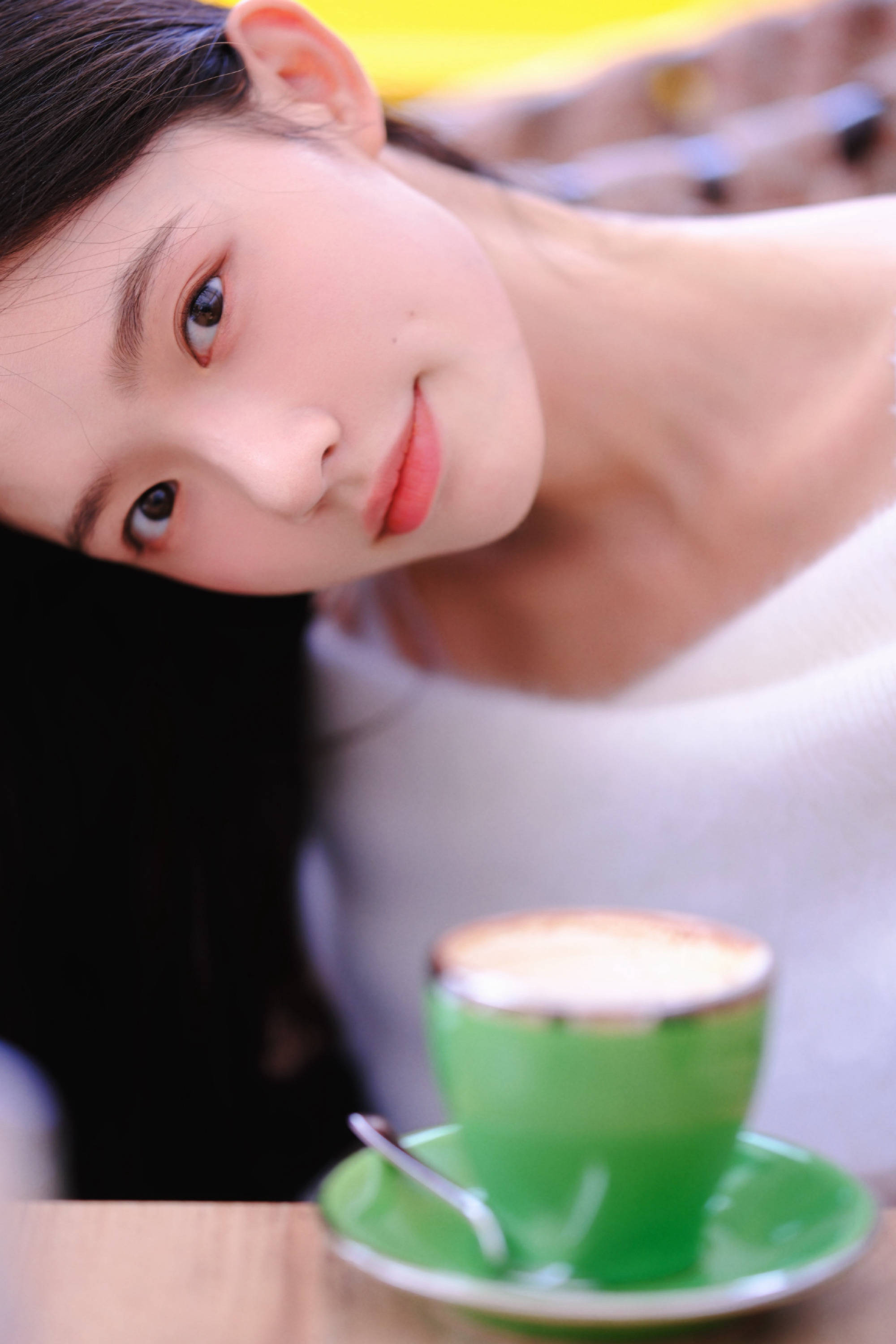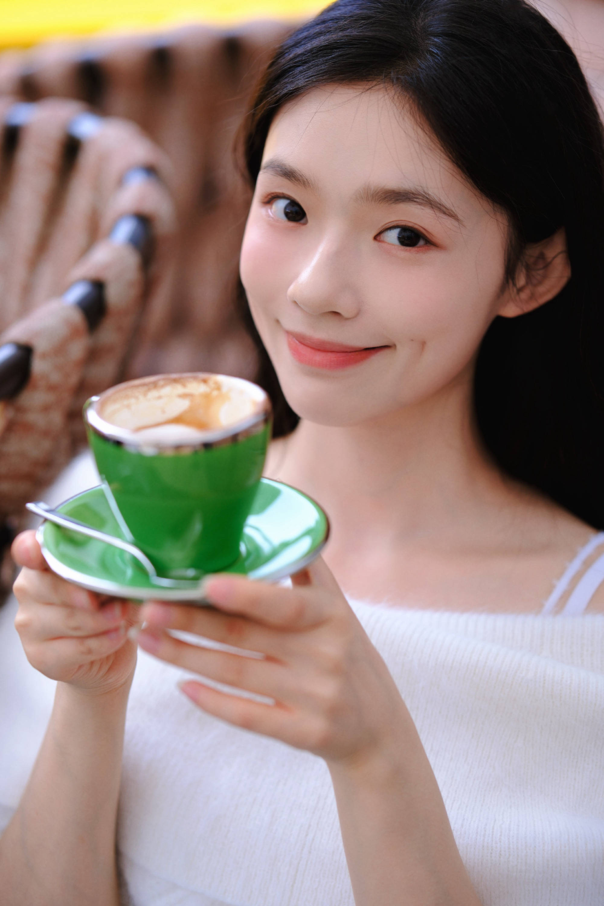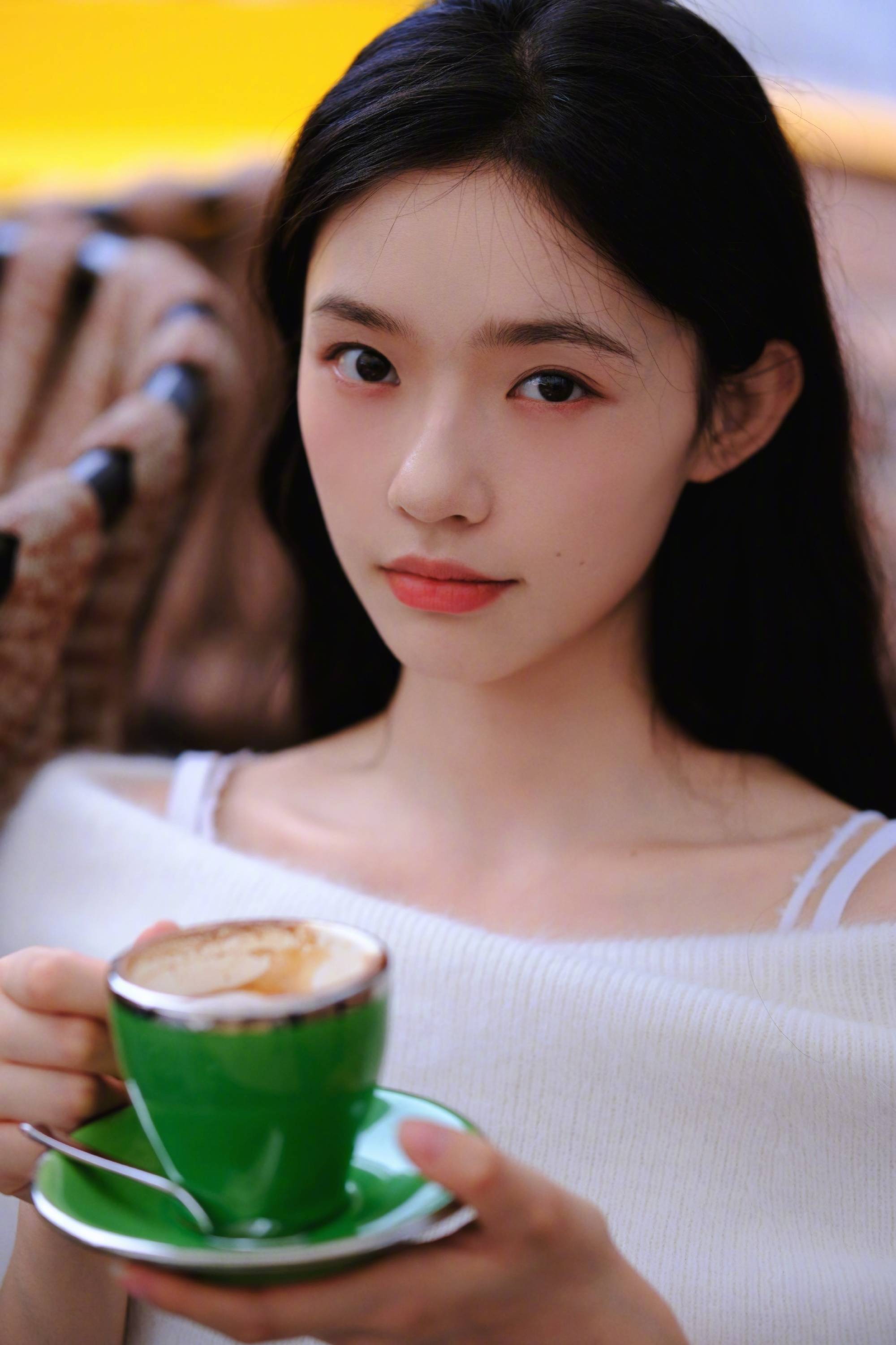 林允品尝咖啡,状态惬意。