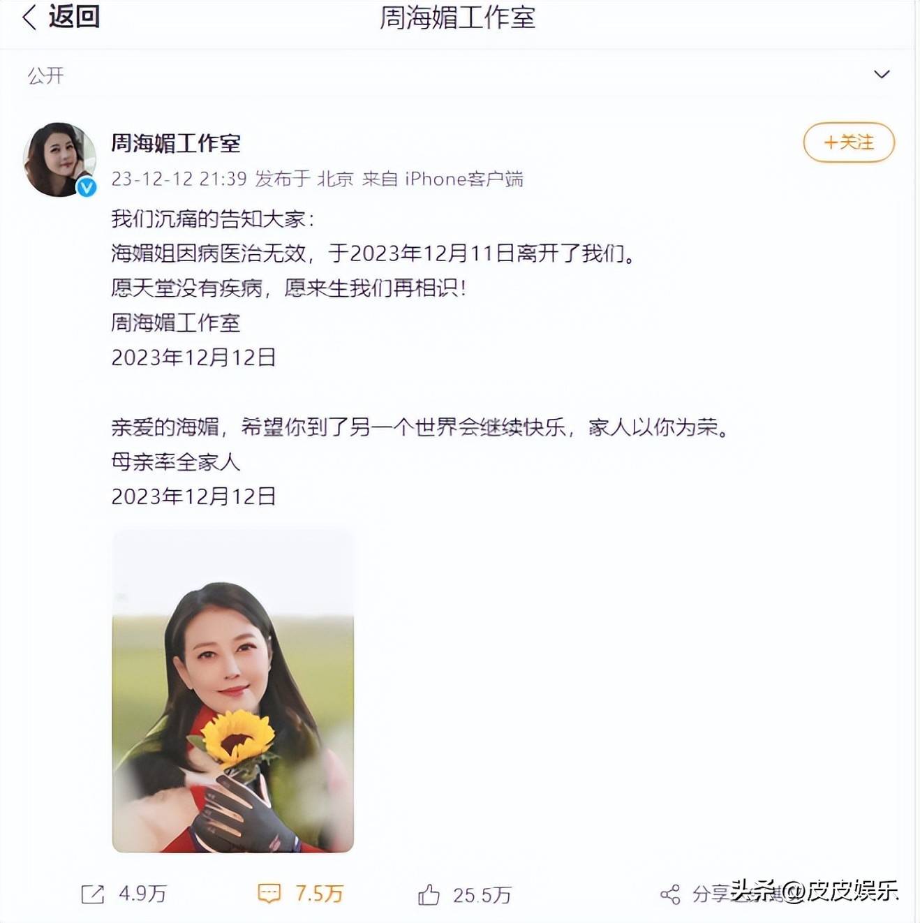 直到2023年12月12日,周海媚工作室发文“海媚姐因病医治无效,12月11日离开了我们。”