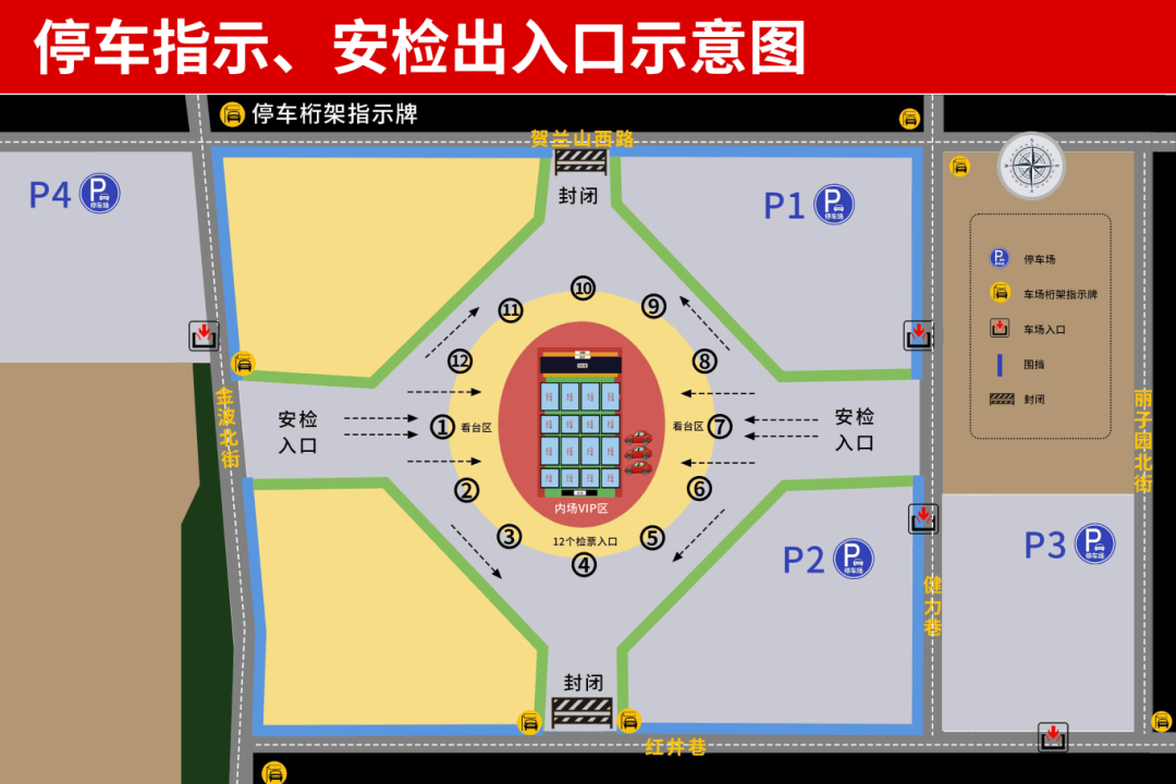 (一)外省市驾车观众可沿银川绕城高速(北段)-亲水街-贺兰山路-丽子园街-红井巷,行驶至贺兰山体育场东侧停车场(红井巷与健力巷东北角)有序停放;宁夏本地观众可将车辆有序停放至贺兰山体育场周边停车场及临时停车区域。