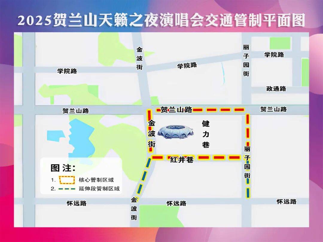 (四)演唱会期间,贺兰山体育场周边小区(万达华宅AB区、中环云熙府、中环西园、橡民小区A区、新怡雅居)居民、商户驾车沿临时专用通道实行右进右出,请周边小区居民、商户按照管制通告要求,合理规划出行路线。