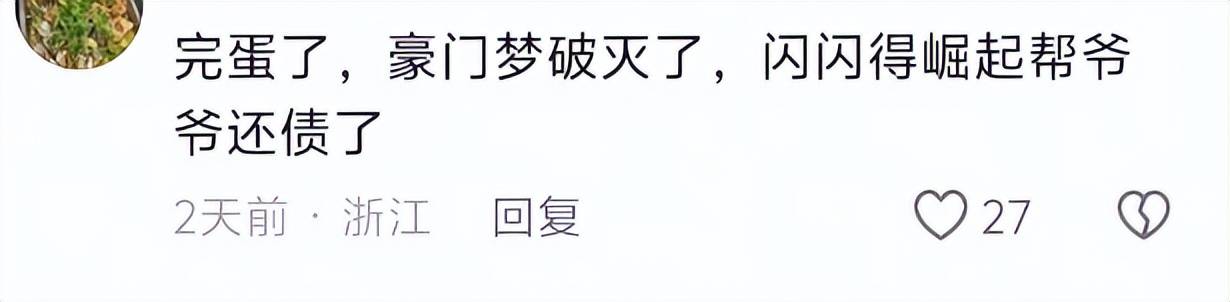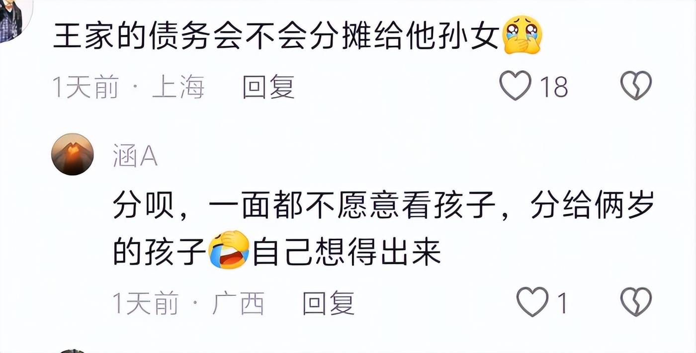 还有网友担心起了闪闪的未来,觉得她以后很可能继承不了王家的家产,甚至还可能承担王家的债务,毕竟王家现在正处于自危的时候。