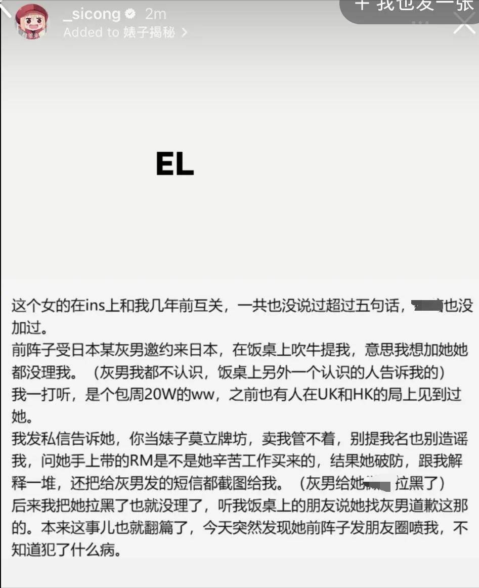 沉寂许久的王思聪突然在外网社交平台大爆猛料,称网红EL是20万就可以包一周的外围。