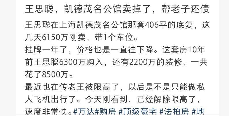 而最近对于他和他家来说,又是在一个微妙的节骨眼上,他爸王健林因为欠债、被限制高消费,一连上了多个热搜,虽然很快就有记者证实他的限高已经取消,但他旗下企业这几年确实挺惨,各种变卖。