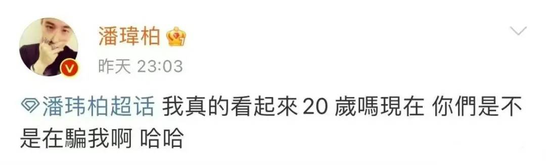 44岁的潘玮柏随后在个人社交账号发文回应:“我真的看起来20岁吗现在,你们是不是在骗我啊,哈哈。”