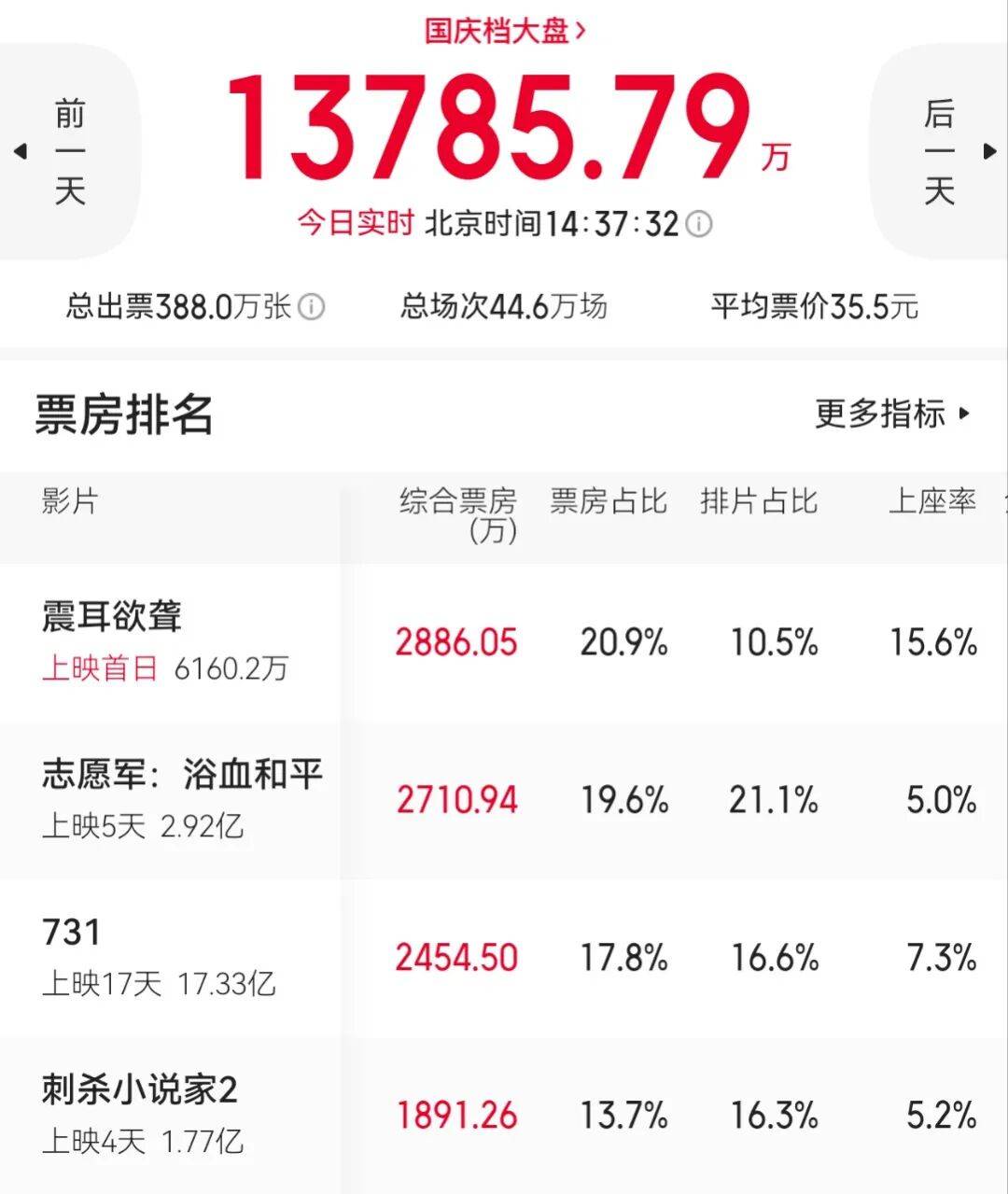 10月4日12点上映,仅两个小时票房即突破六千万,排片虽只有10.5%,却贡献了20.9%的票房,15.6%的上座率更是一骑绝尘!