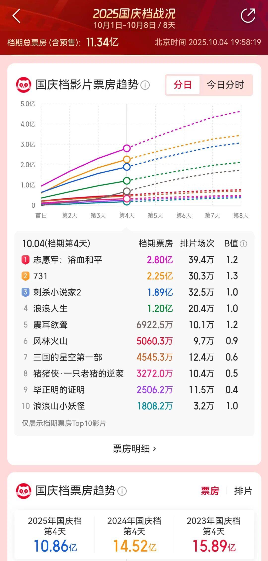 才二天,国庆档大盘即跌破3亿,都说今年的国庆档最惨淡,大盘的走势真真切切把“惨淡”给体现出来了,多部新片上映能打的不过一部《志愿军3》。