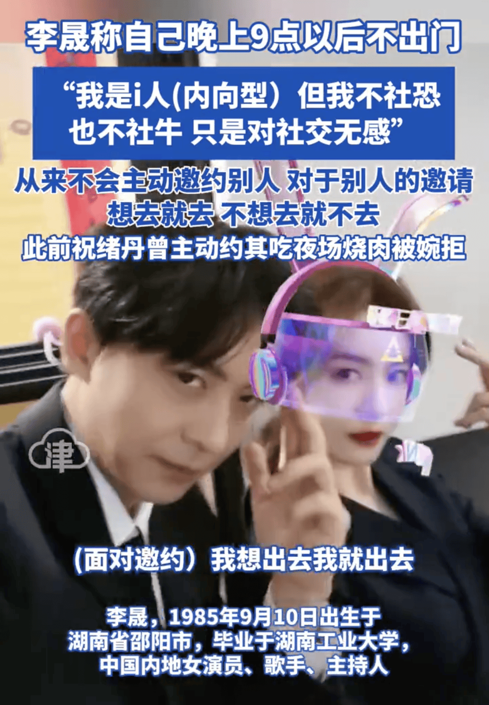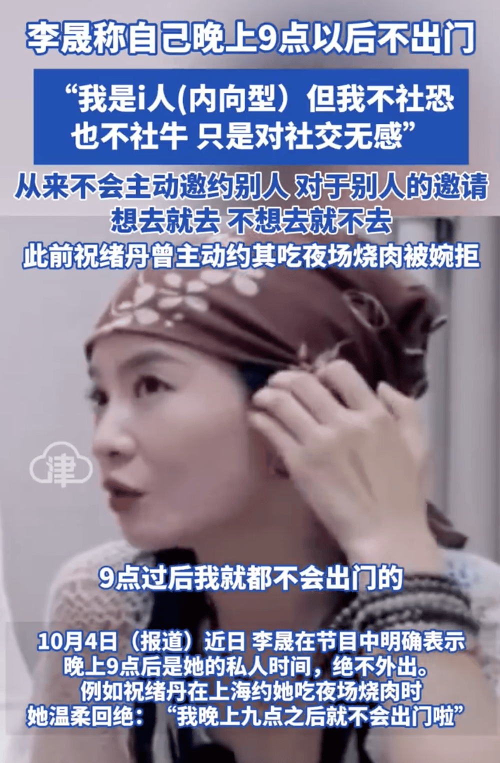 近日,李晟在节目中明确表示,晚上9点后是她的私人时间,绝不外出。例如祝绪丹在上海约她吃夜场烧肉时,她温柔回绝:“我晚上九点之后就不会出门啦。”