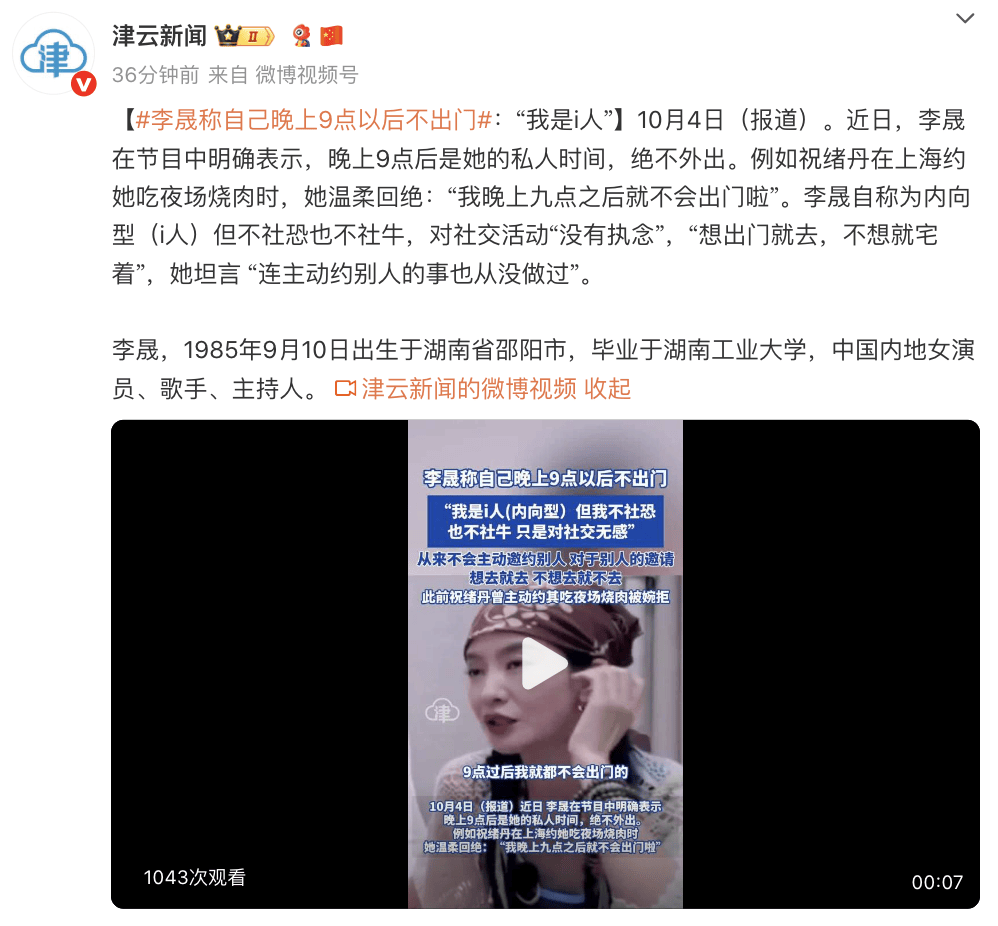 李晟称自己晚上9点以后不出门:我是i人,对社交无感