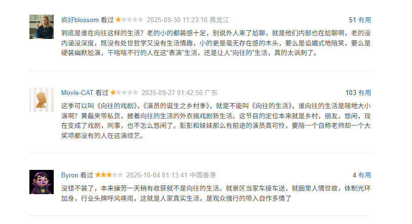 在诸多差评中,很多人都对节目组转型成以“戏剧”为主题感到不满,认为节目是在借“向往”的壳做别的节目。曾经《向往的生活》的初心是放慢脚步、放下工作,去感受和投身田园生活,而如今初心似乎也已经发生了改变,你们觉得新一季节目观感如何呢?