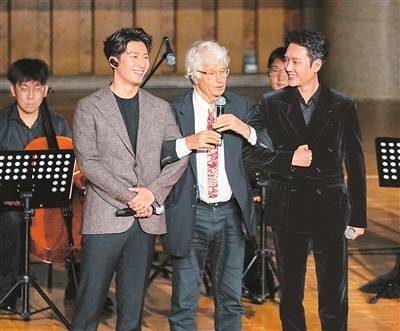 电影《狼图腾》导演让-雅克·阿诺(前排左二)与中国演员冯绍峰(前排右一)、窦骁在“光影百年·中法同行”电影音乐会上互动。 新华社记者 谢 晗摄