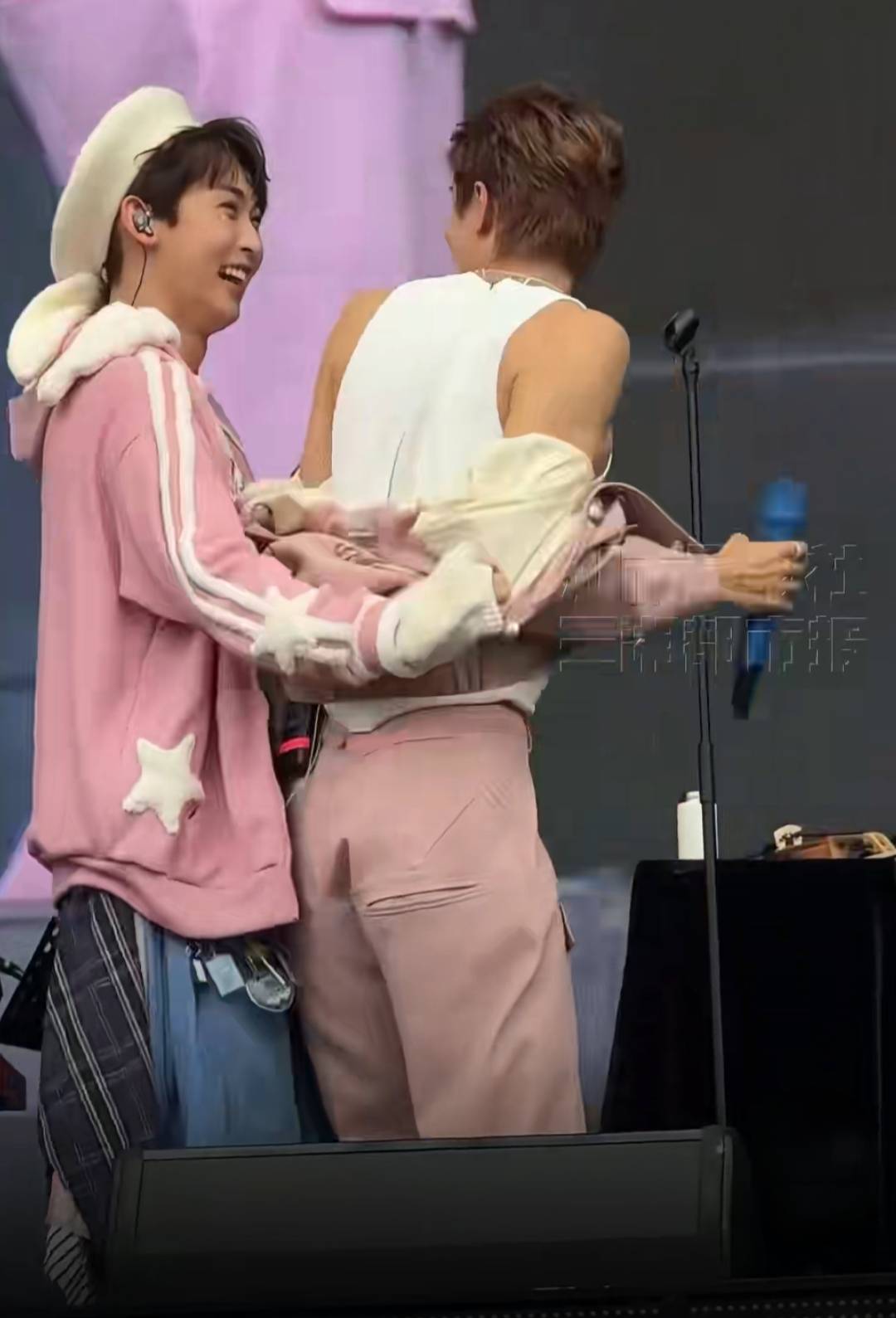 视频显示,唐九洲冲上舞台后,左手抓住周峻纬外套领口,右手迅速扯开,动作行云流水。周峻纬先是一愣,随即笑着追打对方,台下观众瞬间沸腾,尖叫声穿透音乐节现场。周峻纬被扒衣后仍保持微笑,边整理衣物边调侃“唐九洲你完了”,而唐九洲则躲在工作人员身后做鬼脸。