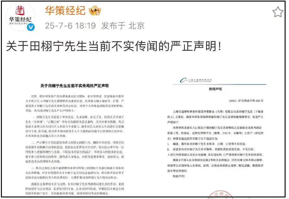 风波愈演愈烈,田栩宁本人始终不曾出面回应,经纪公司也是拖拖拉拉,闹了半月有余才发表一纸声明,称田栩宁没有结婚生子,目前已经单身。但对于辱女言论,却只字不提。