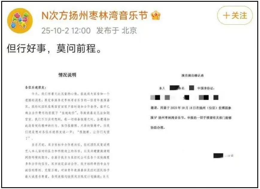 此前已经预热过多次的扬州枣林湾音乐节主办方突然发声明,称由于某位表演嘉宾临时坐地起价,导致音乐节名单无法如期官宣,此事火速引发围观,网友经过深扒,目标直指田栩宁。