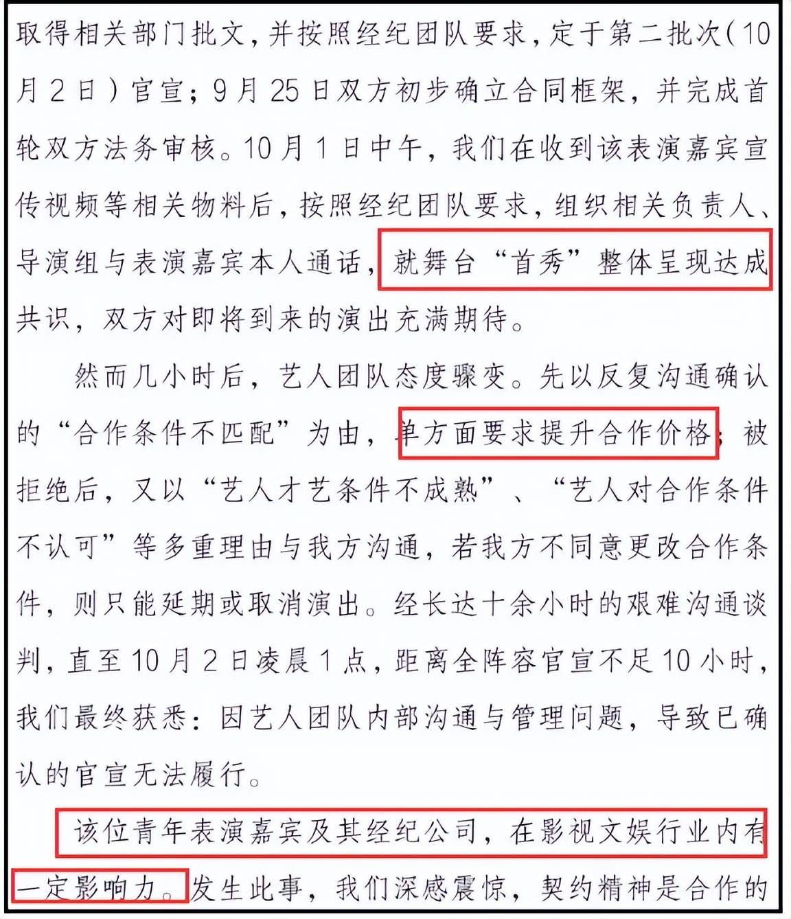 主办方在声明中透露了几个关键点,“年轻艺人”、“首秀”、“背靠大公司”,并直言该艺人和所属公司,此前一直积极与他们洽谈,甚至在违约前一天双方还敲定了细节,但短短几个小时后,对方就开始单方面提升价格,被拒绝后又找理由终止合作。