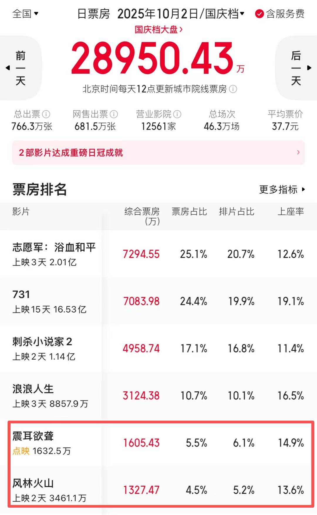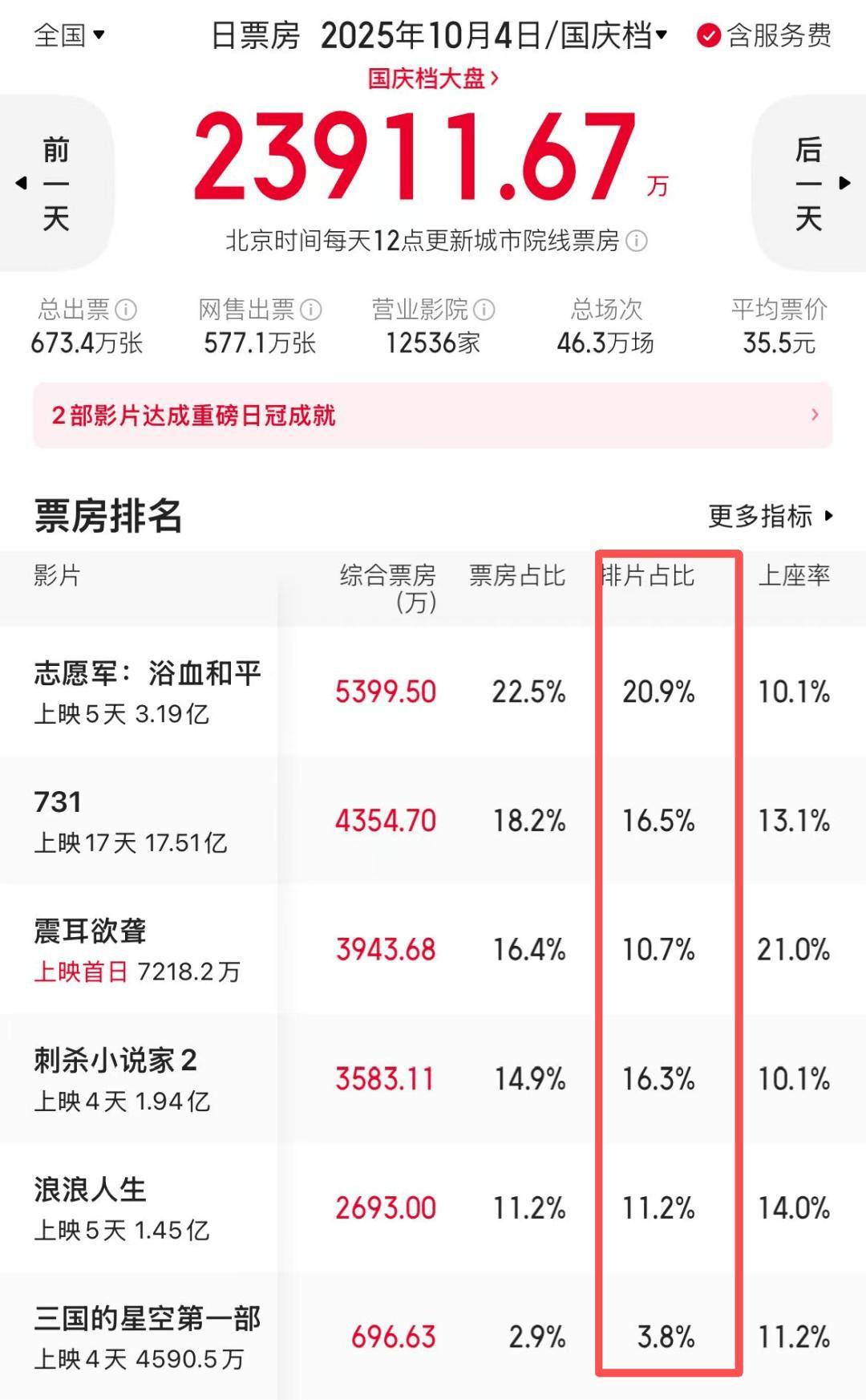 10月4日,《志愿军:浴血和平》《刺杀小说家2》等国庆档新片单日票房稍降,彼时正值上映首日的《震耳欲聋》本有机会争取争更多的排片。但实际上,其首日排片占比(10.7%)远远低于《志愿军3》(20.9%)、《731》(16.5%)、《刺杀小说家2》(16.3%)、《浪浪人生》(11.2%),可见院线对这部电影的期望并不高。