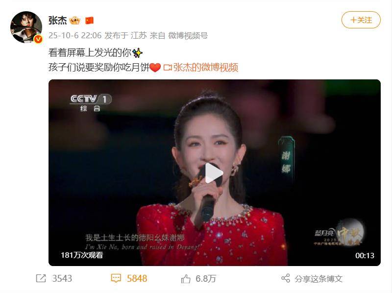 就连央视总撰稿杨启舫也以“麻辣月饼”精准点评她的风格:庄重外壳包裹着川味内核。而最动人的认可来自家人——演出结束后,张杰在微博发文:“看着屏幕上发光的你;孩子们说要奖励你吃月饼。”原来三岁双胞胎跳跳、俏俏和小女儿小咘芽通过直播看到妈妈表演后,童趣十足地提出要给妈妈“月饼奖励”。