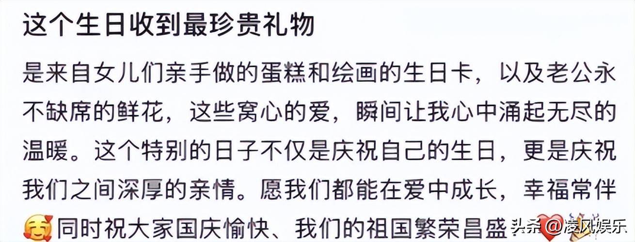 黎姿晒出的照片中并没有丈夫和三个女儿的身影,但上一条微博她的暖心文案提到了丈夫和女儿们。
