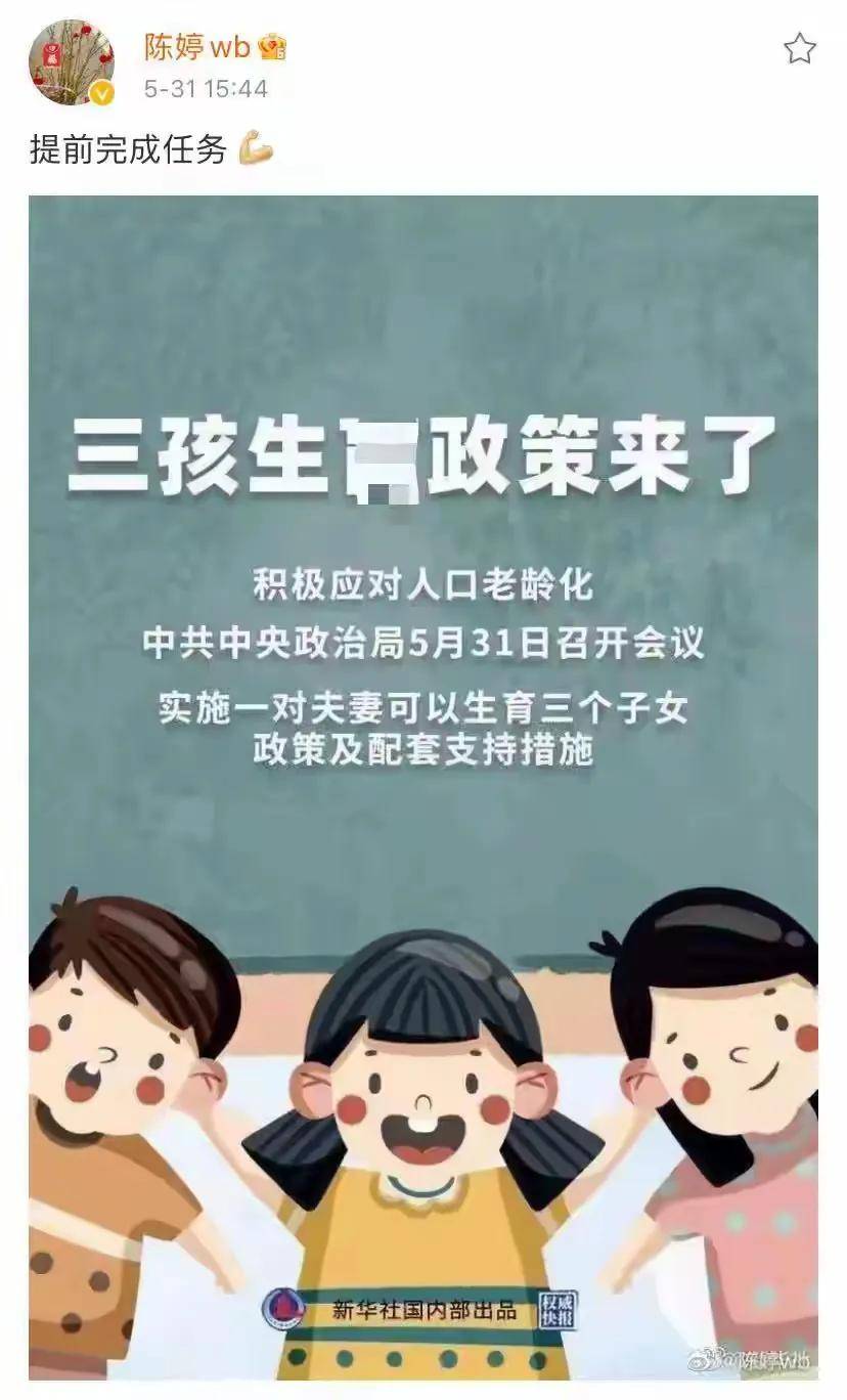出“三孩”政策之后,陈婷第一时间发微博炫耀,提前完成任务。