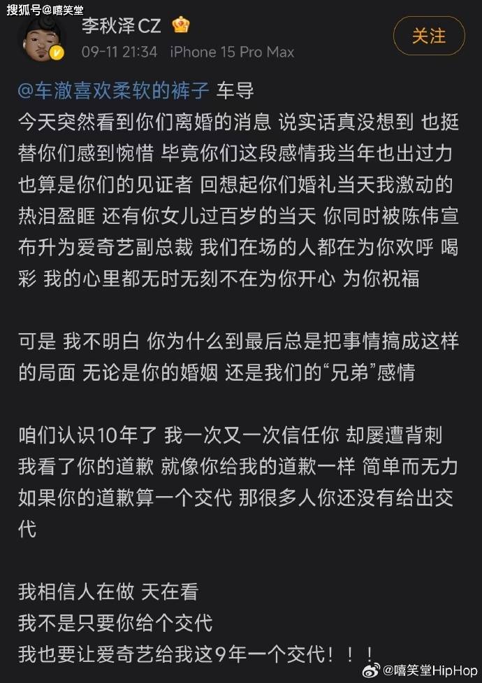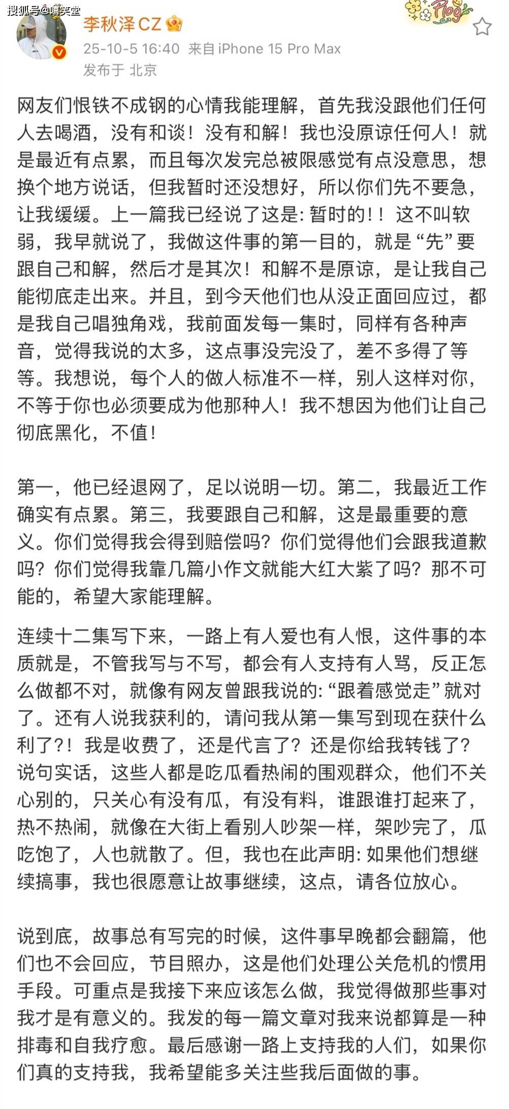 李秋泽突然发文表示,他将暂时停更。也就是说,李秋泽将暂停爆料车澈。