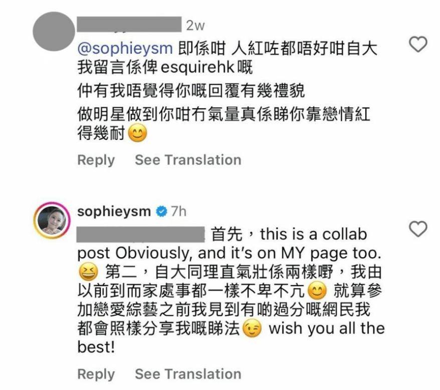 该网友依旧不依不饶,又回复:“也就是说,人红了就别这么自大,我留言是给ESQUIREHK(港版《时尚先生》)的,而且我没觉得你的回应有多礼貌。做明星做到你这么没气量,倒要看看你靠恋情能红多久。”