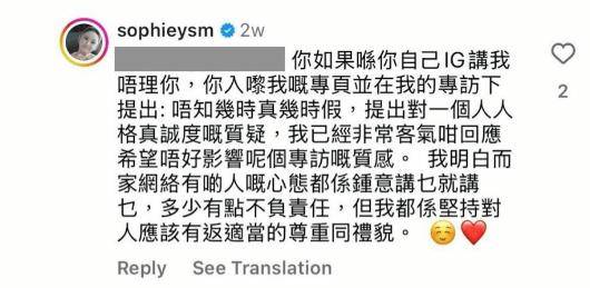 叶蒨文再次回复:“你如果在自己的IG上说我,我不会管,但你跑到我的主页,还在我的专访下面说‘不知道哪句是真哪句是假’,对一个人的人格真诚提出质疑,我已经非常客气地回应了,希望不要影响到这篇专访的质感。我明白现在网络上有些人的心态就是想说什么就说什么,多少有点不负责任,但我还是坚持做人应该保持适当的尊重和礼貌。”