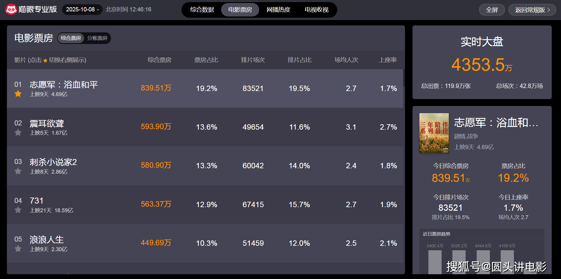 截止10月8日中午12时46分,从“猫眼专业版”实时数据显示可知,当前热映电影中,票房榜前五分别如下: