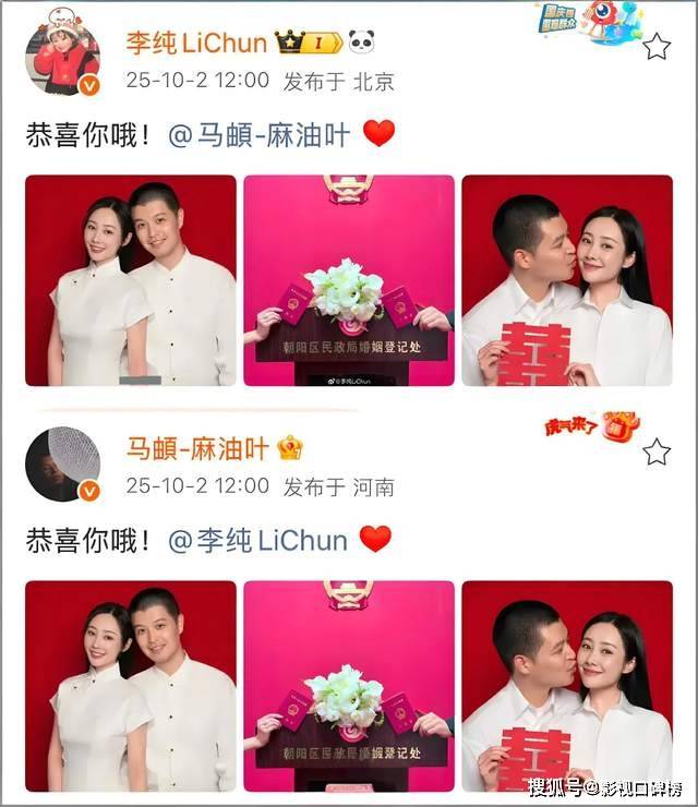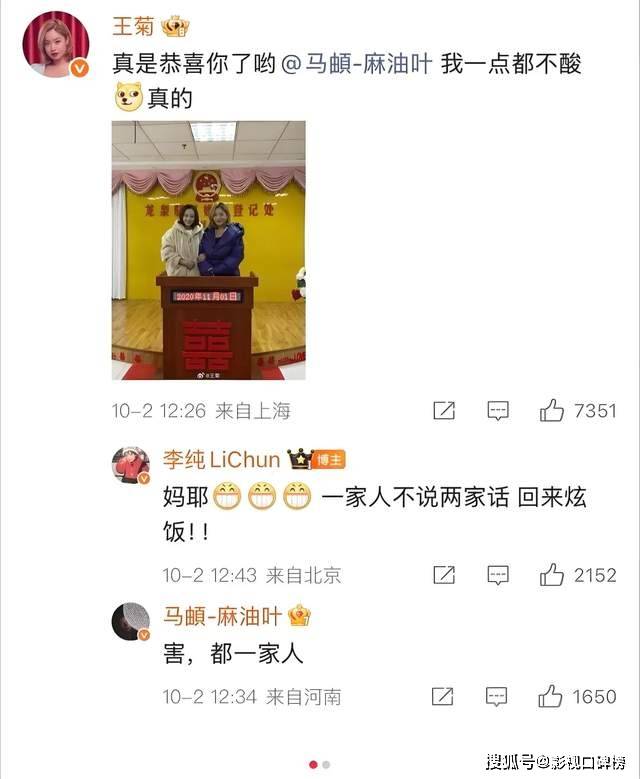 李纯和马頔于10月2日正式官宣结婚,并于零点在其社交平台同步晒出红底结婚照及北京朝阳区民政局领证现场照片。配文互相俏皮喊话:“恭喜你哦!”照片中两人皆身着白衣,郎才女貌且举止亲昵,俨然是一对不可多得的爱侣。身为二人好友的王菊第一时间留言送上祝福,表面上是恭喜两人终成眷属,内心里却是直冒酸水,配上和李纯在婚姻登记处的合照,更有一股别样的幽默。
