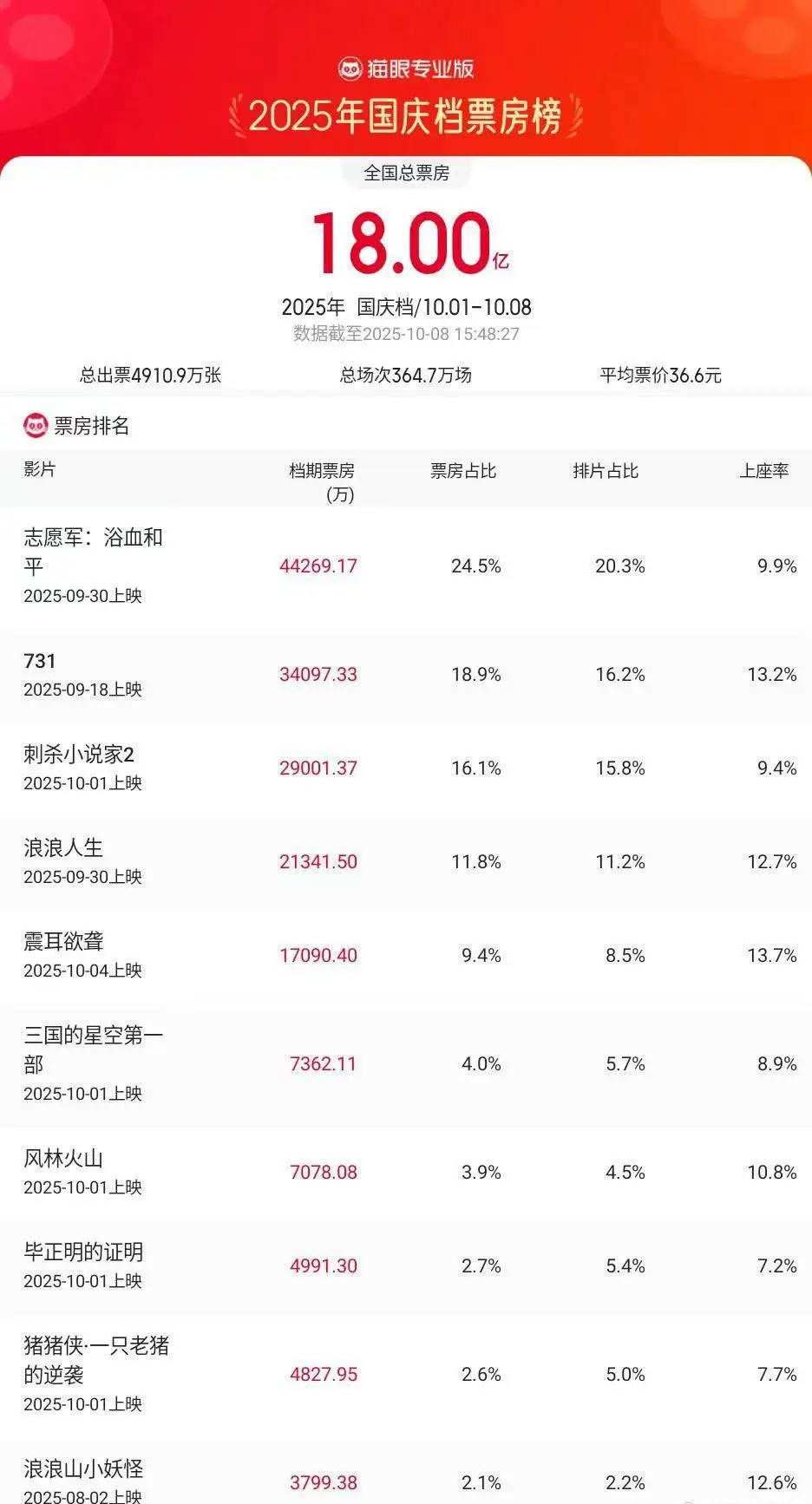 搜狐娱乐讯 据猫眼专业版数据,截至10月8日15时,2025年国庆档档期票房破18亿,《志愿军:浴血和平》《731》《刺杀小说家2》分列国庆档票房榜前三位。