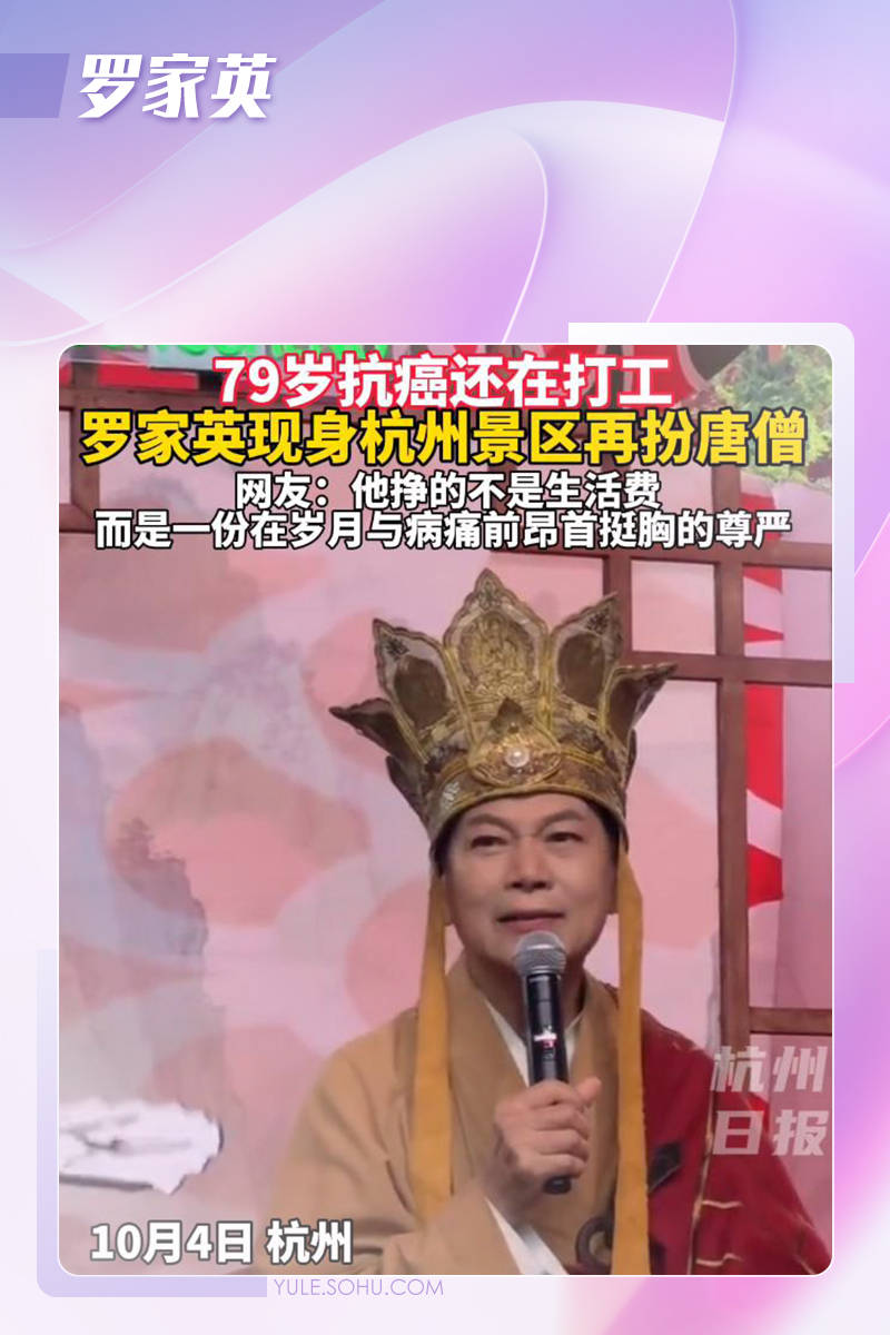 国庆期间,罗家英也罕见加入了景区打工的大军。他扮演的则是《大话西游》中的“唐僧”。已过79岁的罗家英在游街过程中听到游客喊“师傅”,他还配合地比“耶”,看起来状态非常不错。不过今年5月,罗家英曾表示,自己已4次患癌,最多剩下9年寿命,已放弃化疗,引发广泛关注。