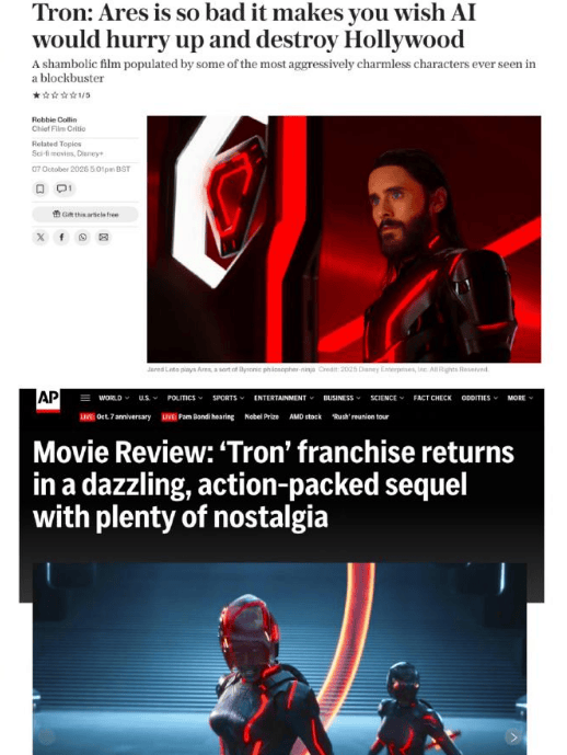最近,迪士尼出品的《创:战神》(TRON: ARES)首映过后,口碑情况争议巨大,下面综合多方媒体评价与观众反馈,一起来看一看!