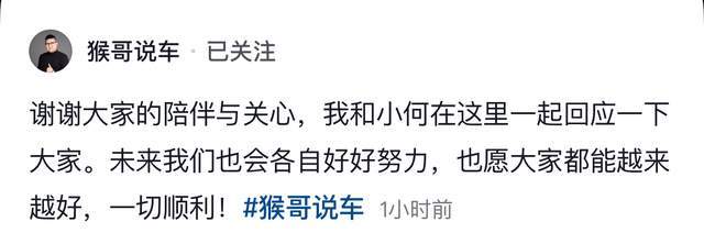 10月8号下午,猴哥说车与何钰欣正式官宣离婚,两人分别于视频账号上分享最后一段视频。