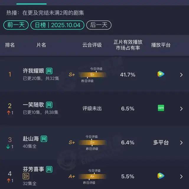 不是粉丝吹啊,实打实的数据,赵露思新剧《许我耀眼》在无宣发空降播出后,迅速创下腾讯视频热度纪录,首日突破2.7万,第四日破3.1万,成为2025年腾讯最快破3万热度剧集,云合市占率最高达41.7%,抖音主话题播放量77.3亿,猫眼连续7天登顶剧集榜。