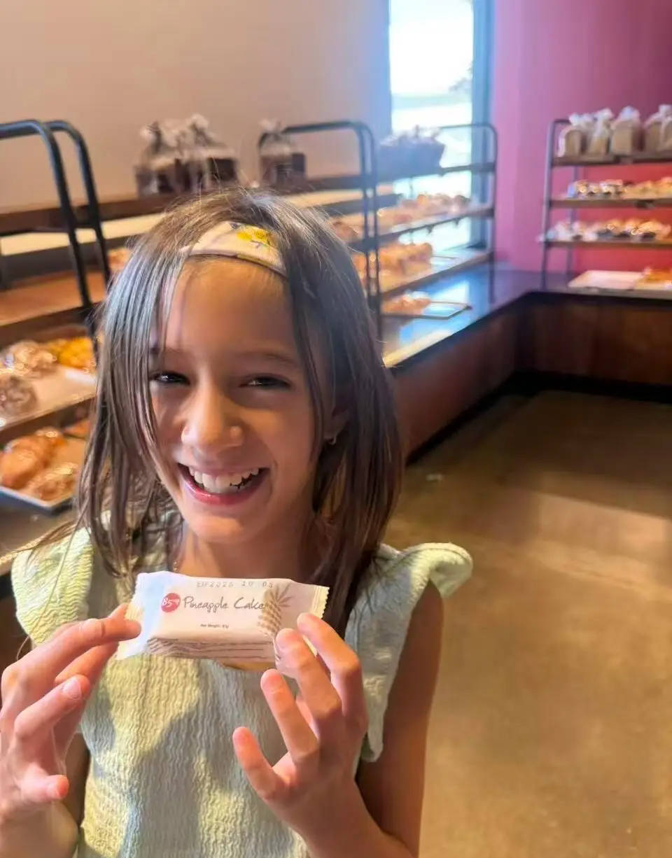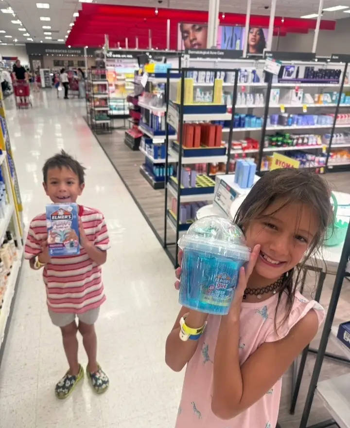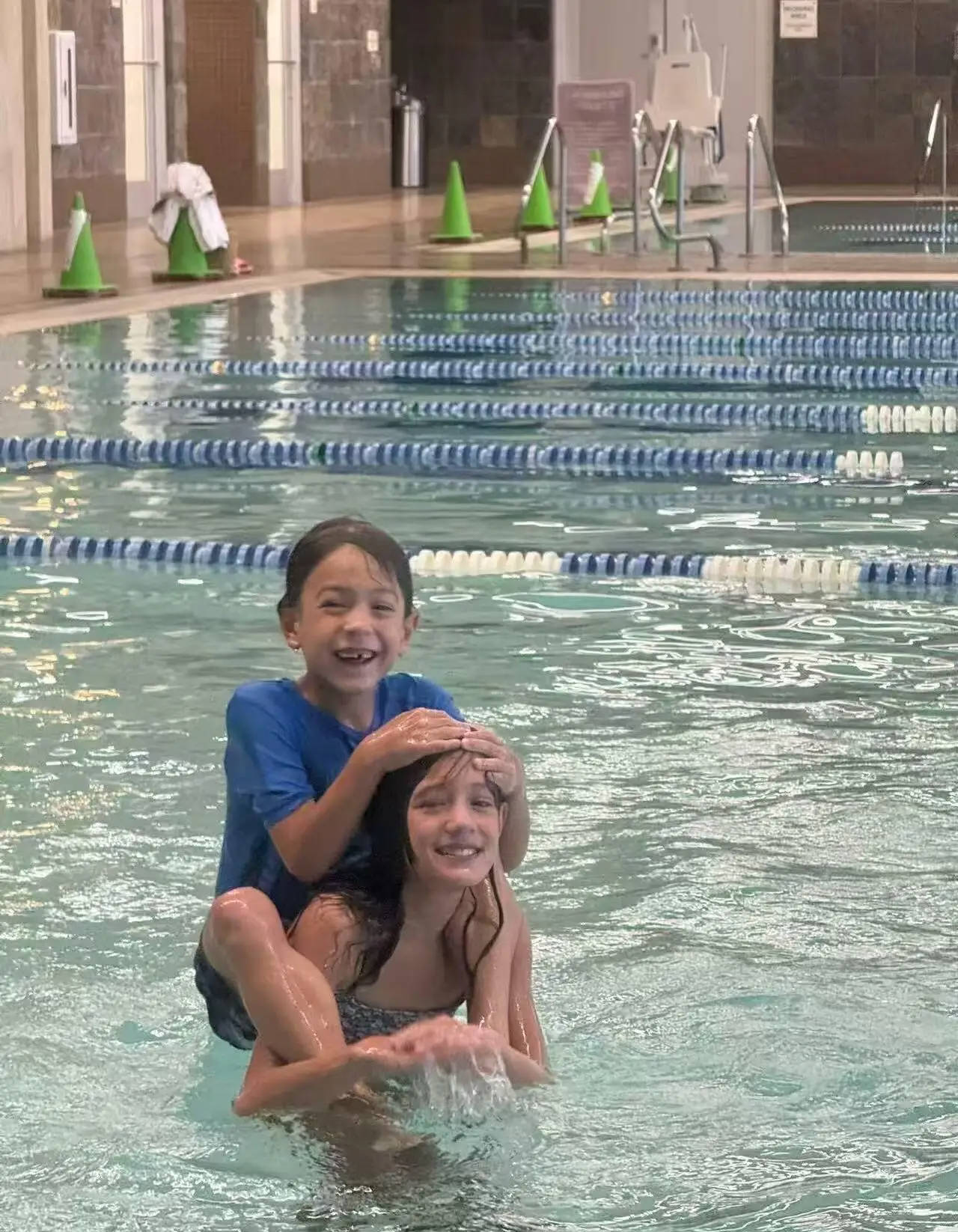 江语晨穿着白色背心,与两个孩子合影,笑容明媚。