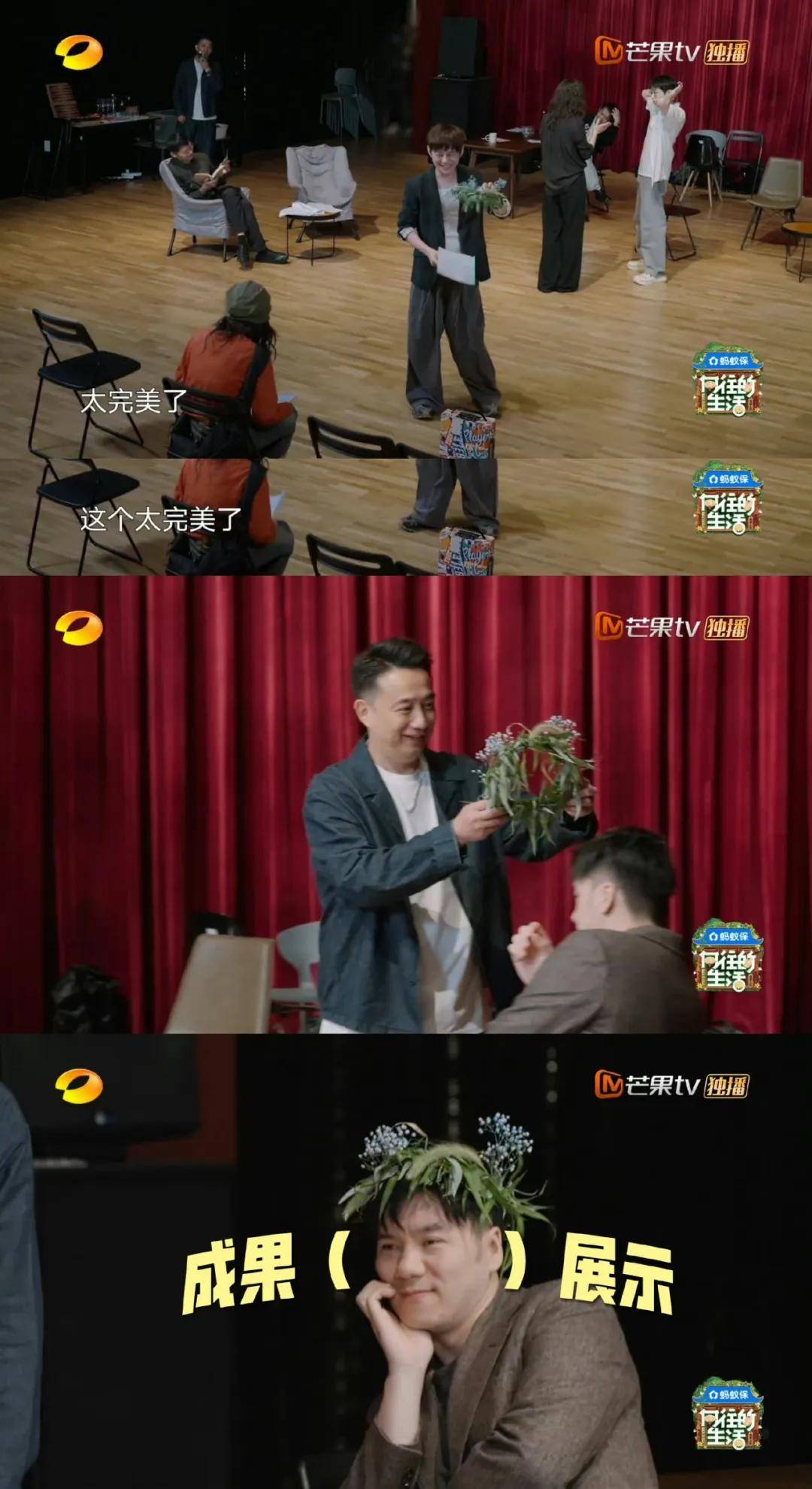 新的主语是黄磊主导的戏剧生活:上一秒大家还在游戏里表演,戏剧存在感虽强,也还算自然,而下一秒黄磊接话:这就是为什么我觉得话剧很好看……只是,黄磊cue起戏剧,仿佛另一种广告植入般,如此高频推荐,观众难免有些跳戏。