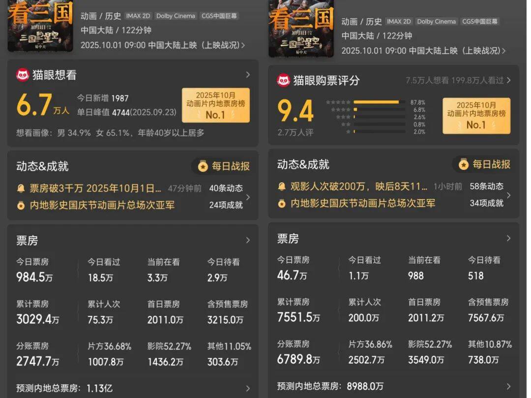 然而电影并不叫座。上映首日,《三国的星空》收获了2044.9万元票房,猫眼专业版预测影片最终票房为1.13亿元,目前已经降至8988万元。