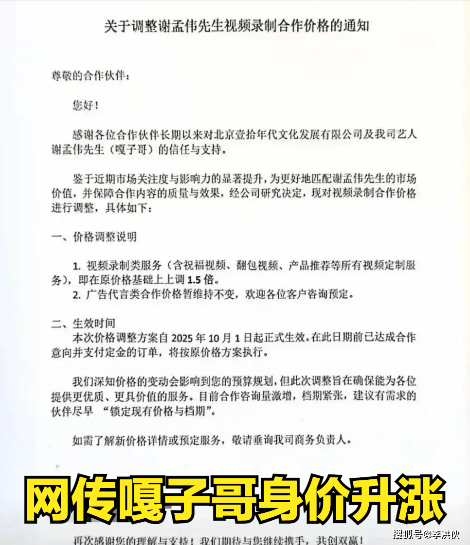 更有意思的就在他被拘留没多久,居然有代理公司跳出来发通知,说要从10月1号开始,把嘎子哥的视频录制服务价格上调1.5倍。理由是近期市场关注度与影响力显著提升。