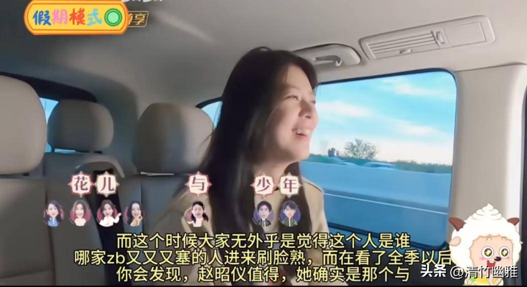 但赵昭仪并不急于表现自己,她甚至幽默地用网友的话来自黑,称自己是《花儿与少年》中的“与”字代表。她的心态特别好,能够清楚地认识到自己的位置。